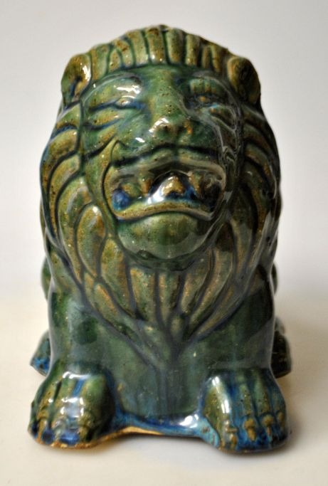 Keramischer Löwe, China. 19. Jahrhundert. Mit grün-bläulicher Glasur. Höhe: 19 cm.