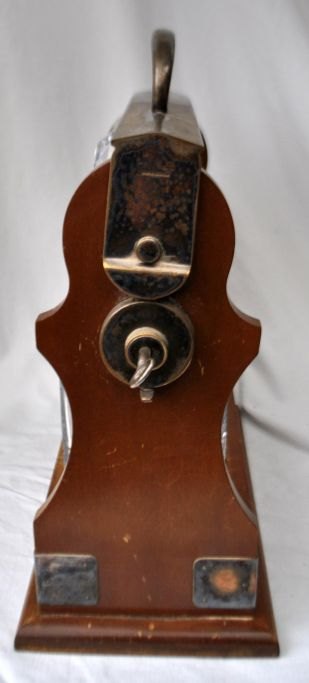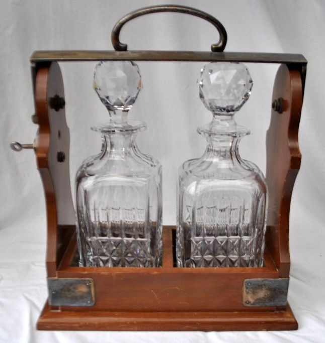 Englischer Tantalus mit zwei Kristallkaraffen, 19. Jahrhundert. Mit Metallbeschlägen und Schloss mit Schlüssel. Gestempelt. Höhe: 32 cm. Länge: 27 cm.