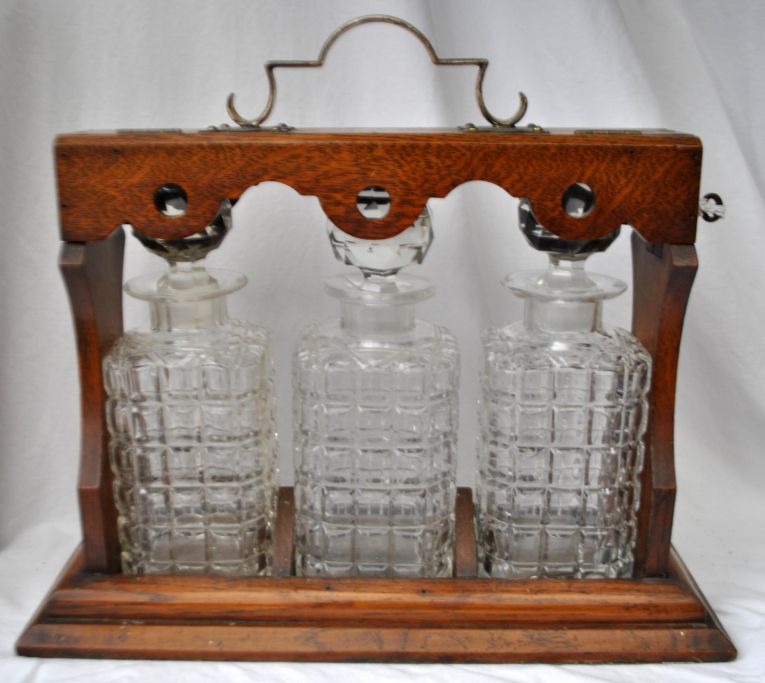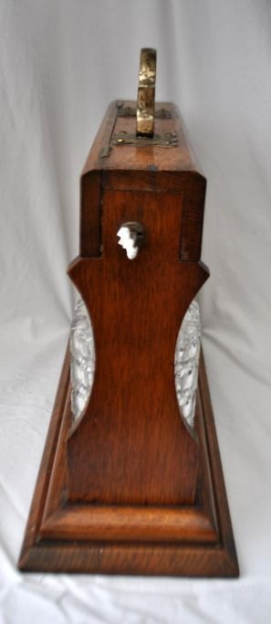 Englischer Tantalus mit drei Kristallkaraffen, 19. Jahrhundert. Eiche. Mit Messingbeschlägen und Schloss mit Schlüssel. Höhe: 33 cm. Länge: 37 cm.
