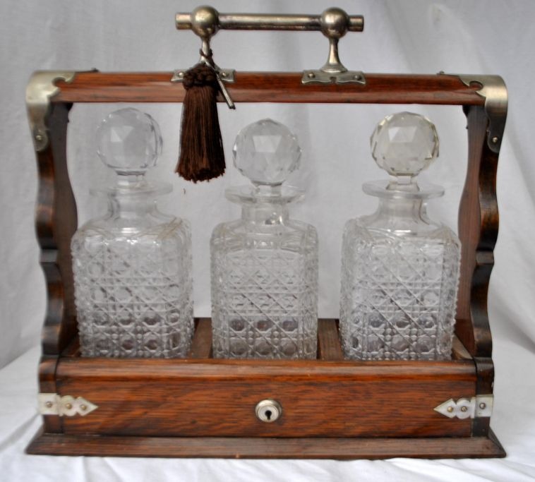 Englischer Tantalus mit drei Kristallkaraffen, 19. Jahrhundert. Polierte Eiche. Mit versilberten Beschlägen und Schloss mit Schlüssel. Höhe: 34 cm. Länge: 38 cm.