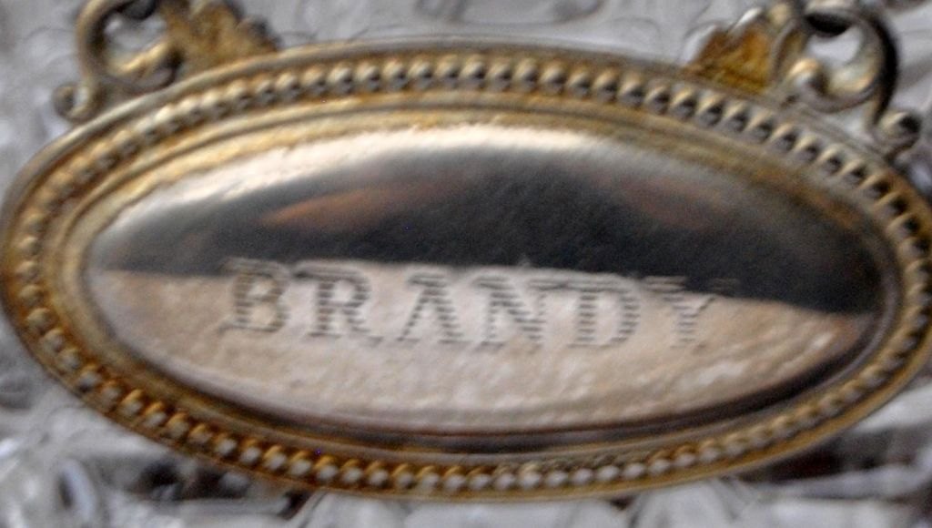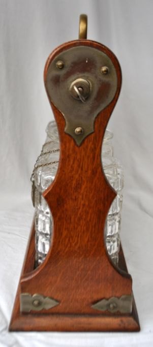 Englischer Tantalus mit drei Kristallkaraffen, 19. Jahrhundert. Polierte Eiche. Mit Messingbeschlägen und Schloss mit Schlüssel. Die Karaffen sind mit versilberten Schildern für Brandy, Sherry und Whisky versehen. Höhe: 31 cm. Länge: 35 cm.