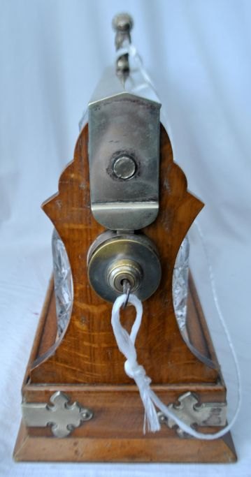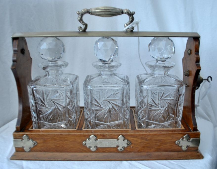 Englischer Tantalus mit drei Dekantern, 19. Jahrhundert. Polierte Eiche. Mit versilberten Beschlägen und Schloss mit Schlüssel. Höhe: 32 cm. Länge: 41 cm.