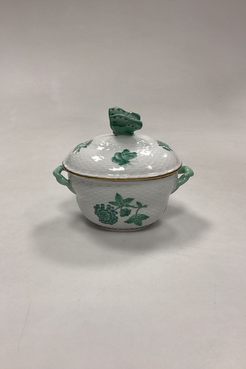 Herend Chinese Bouquet Grøn Lågskål No. 6018/VAV. Måler 11 cm med sommerfugl x 13,5 cm med hanke.