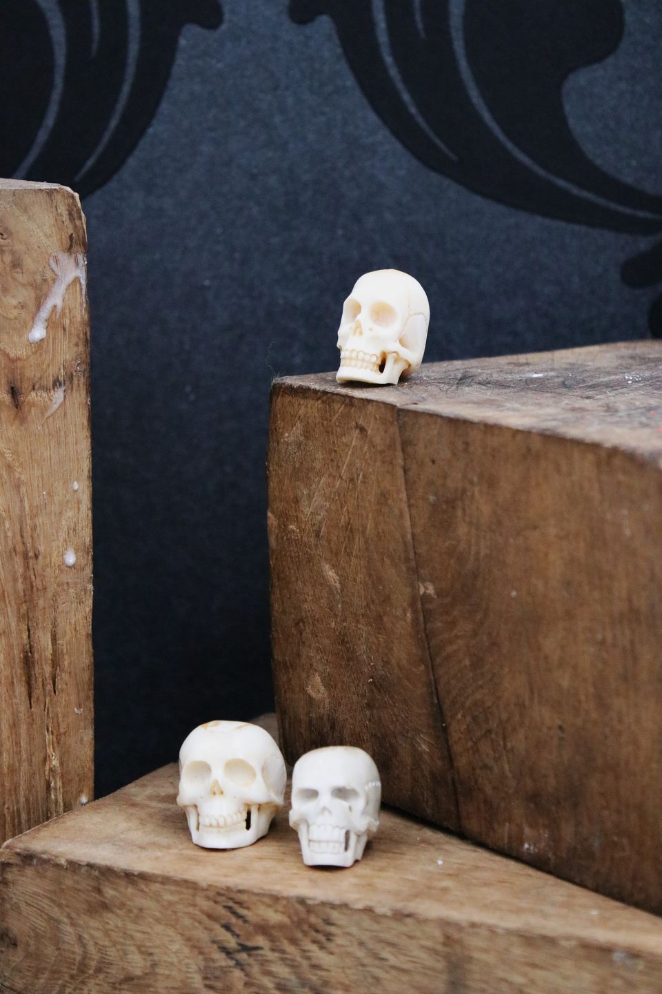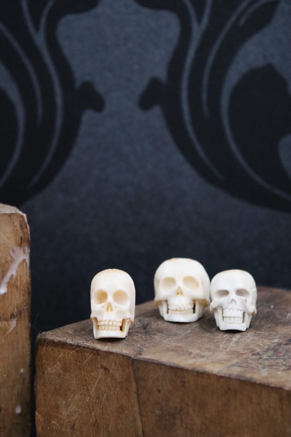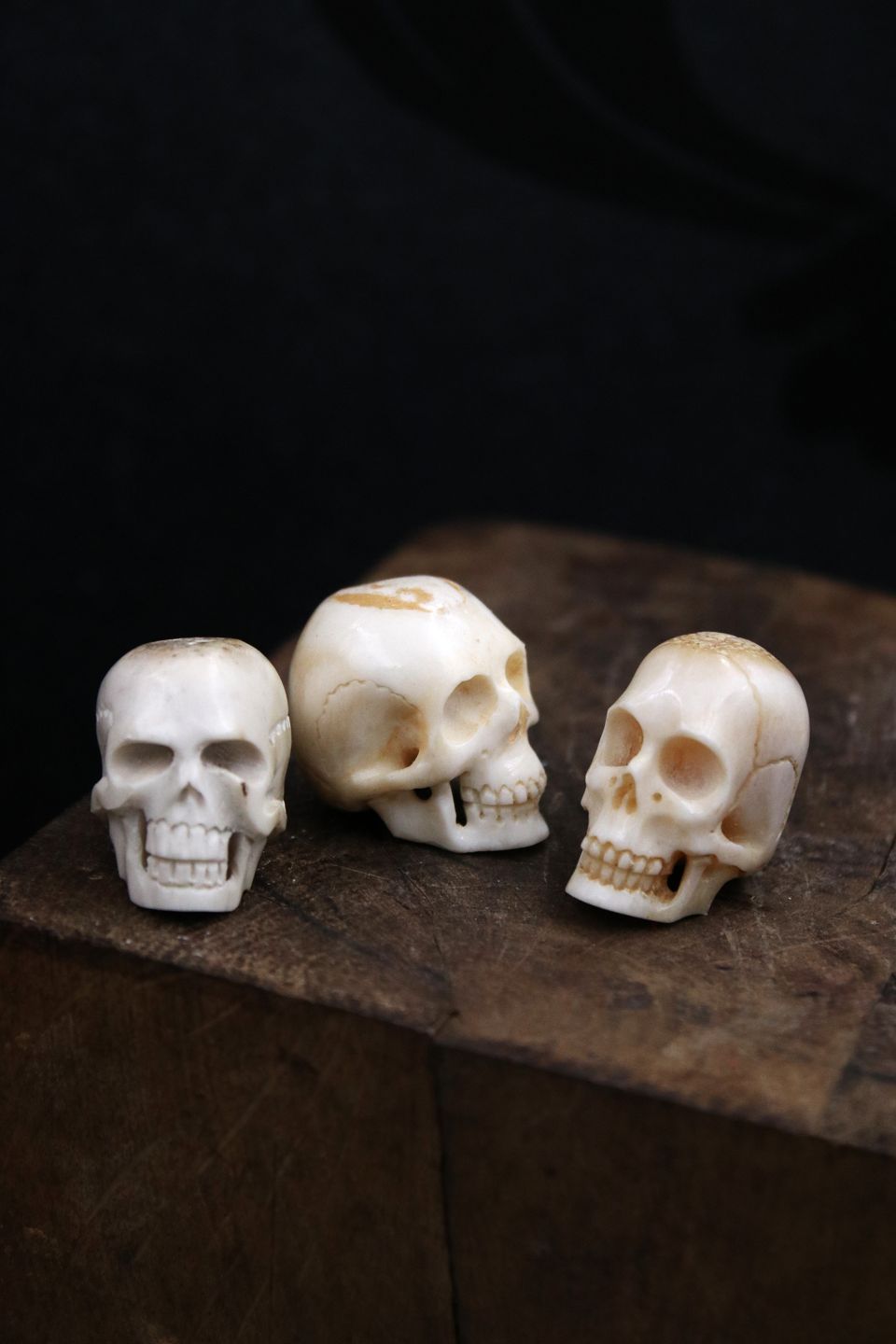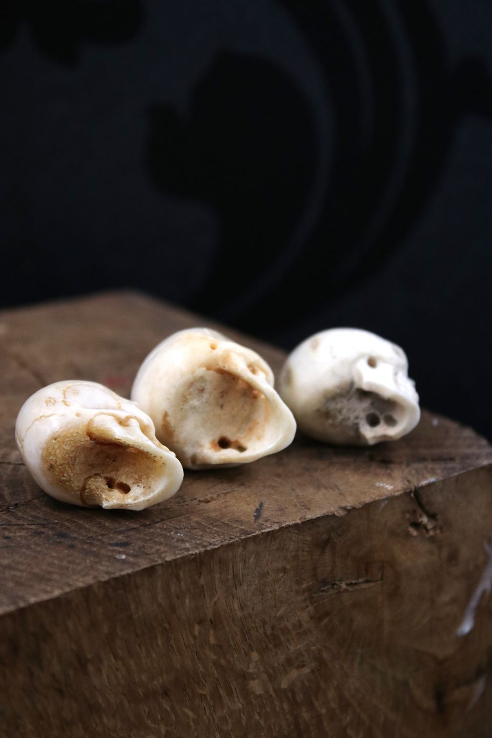 Gamle, dekorative mini kranier udskåret i horn / ben.