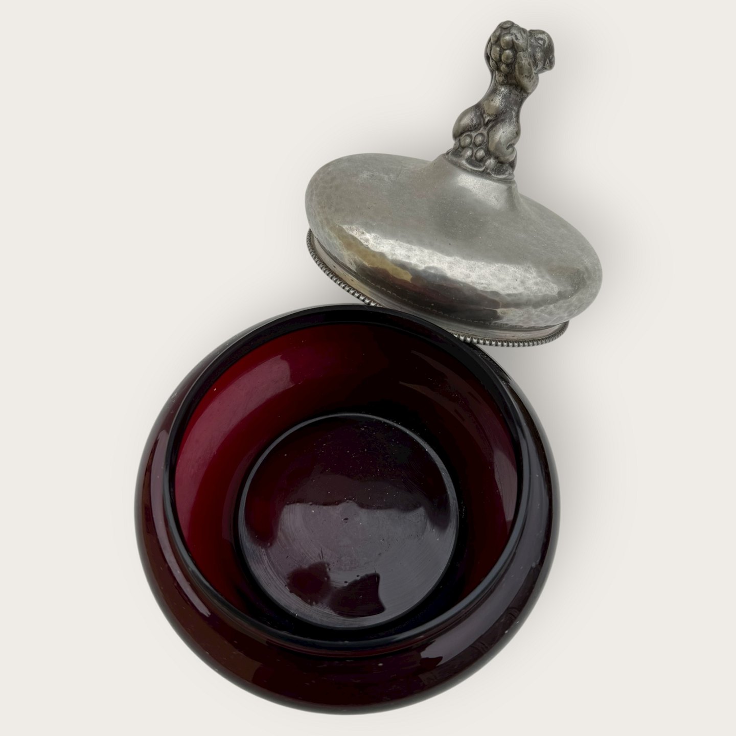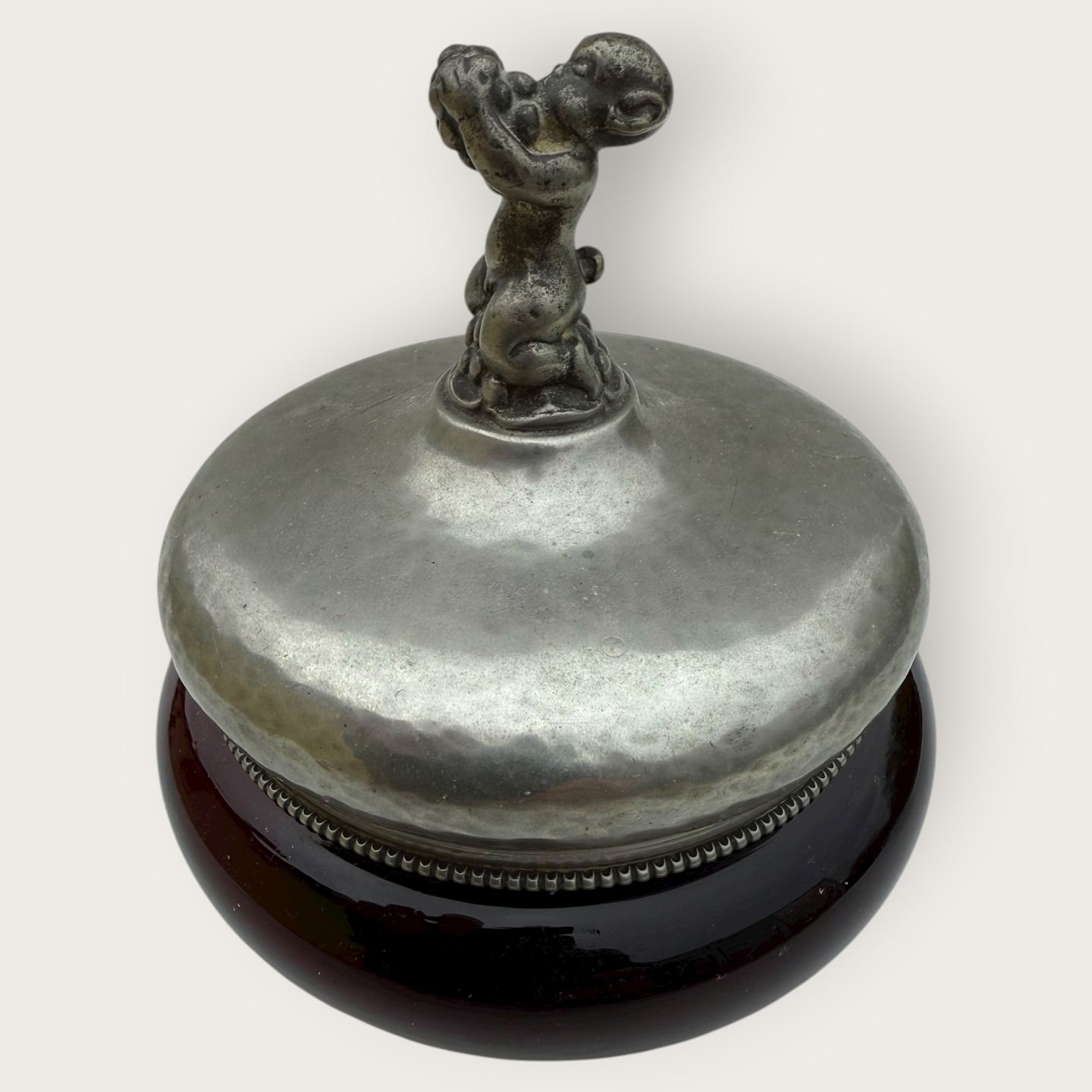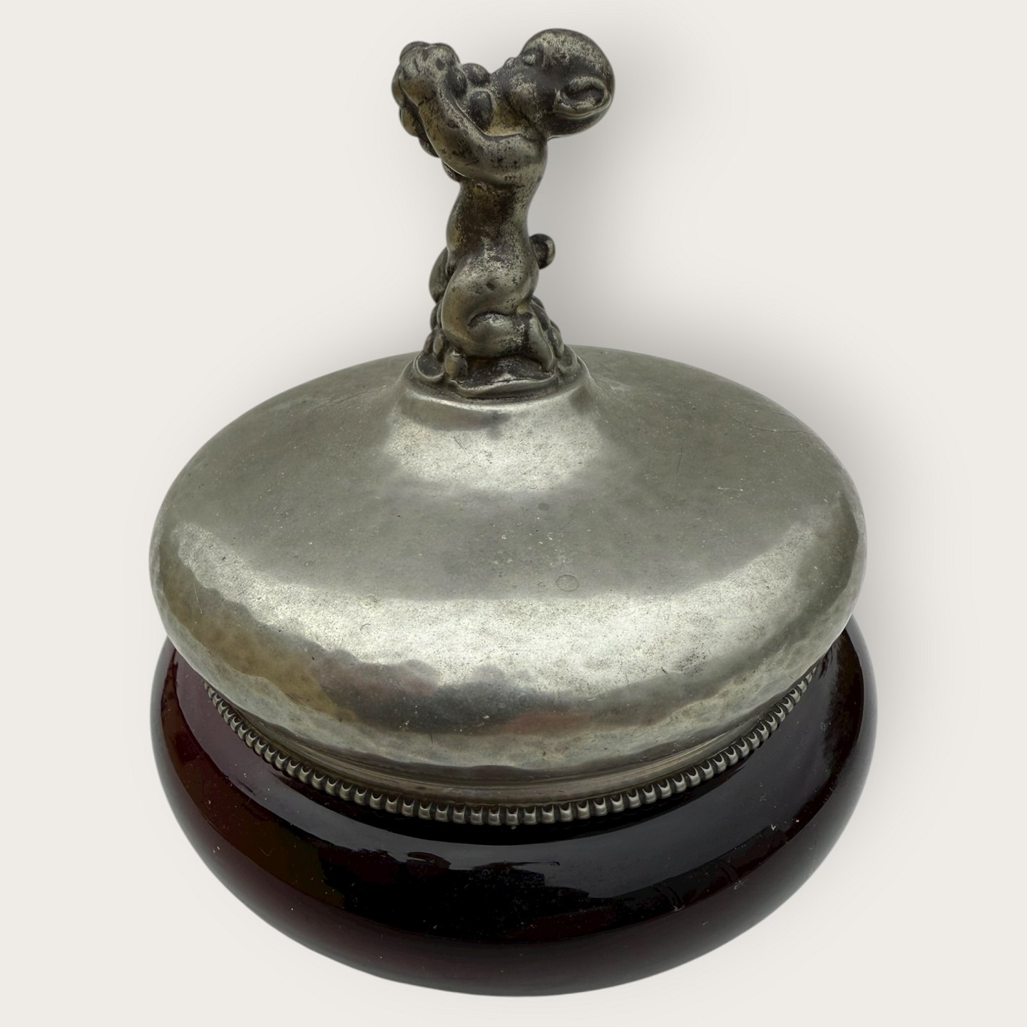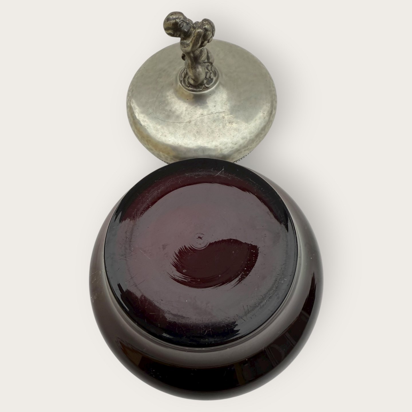 Einar Dragsted, rote Glasschale mit Zinndeckel und der Figur des Bacchus/Dionysos in der Mitte des Deckels, der Deckel innen mit einem Greif und ED für Einar Dragsted gestempelt, Höhe 15 cm, Durchmesser 13 cm *schöner, patinierter Zustand*