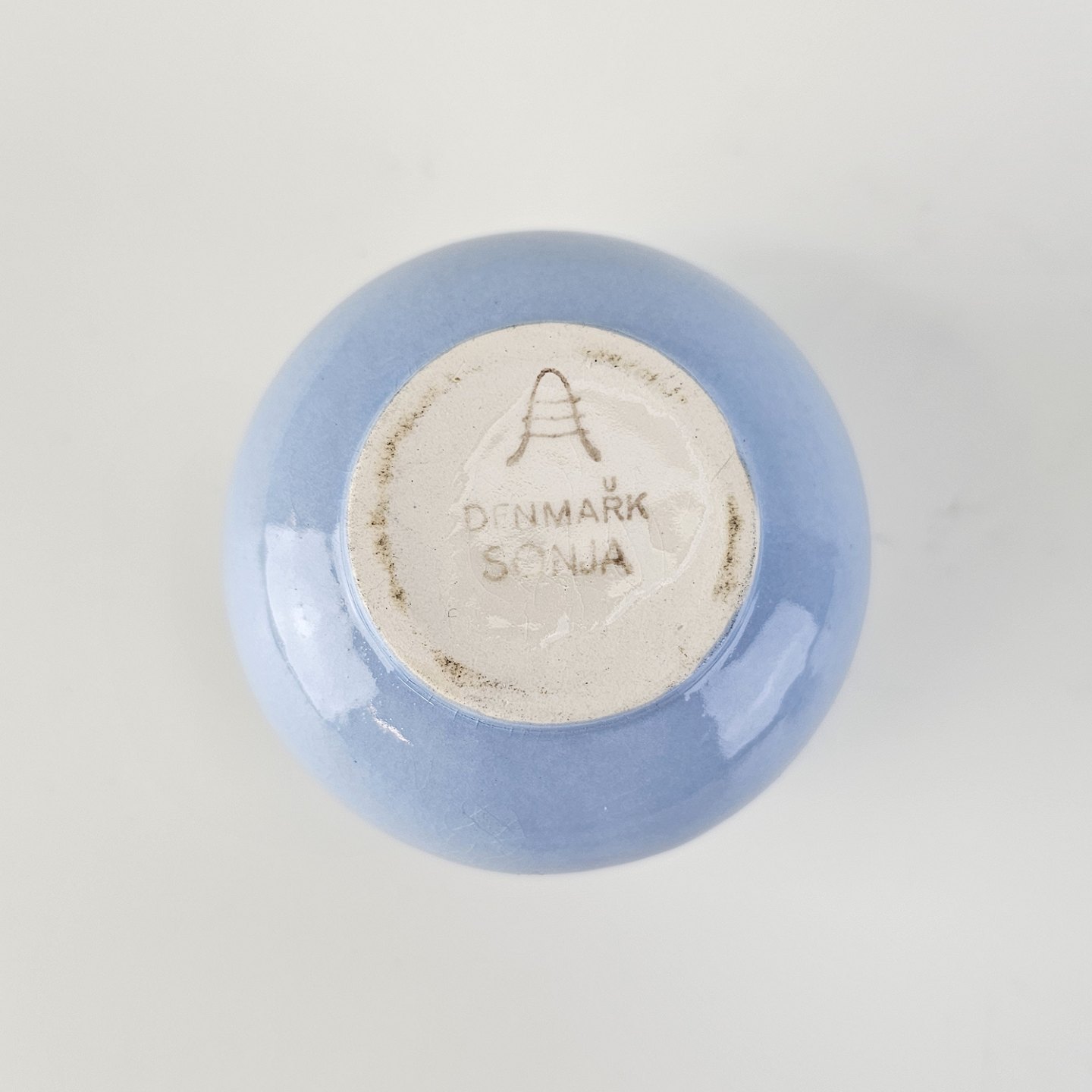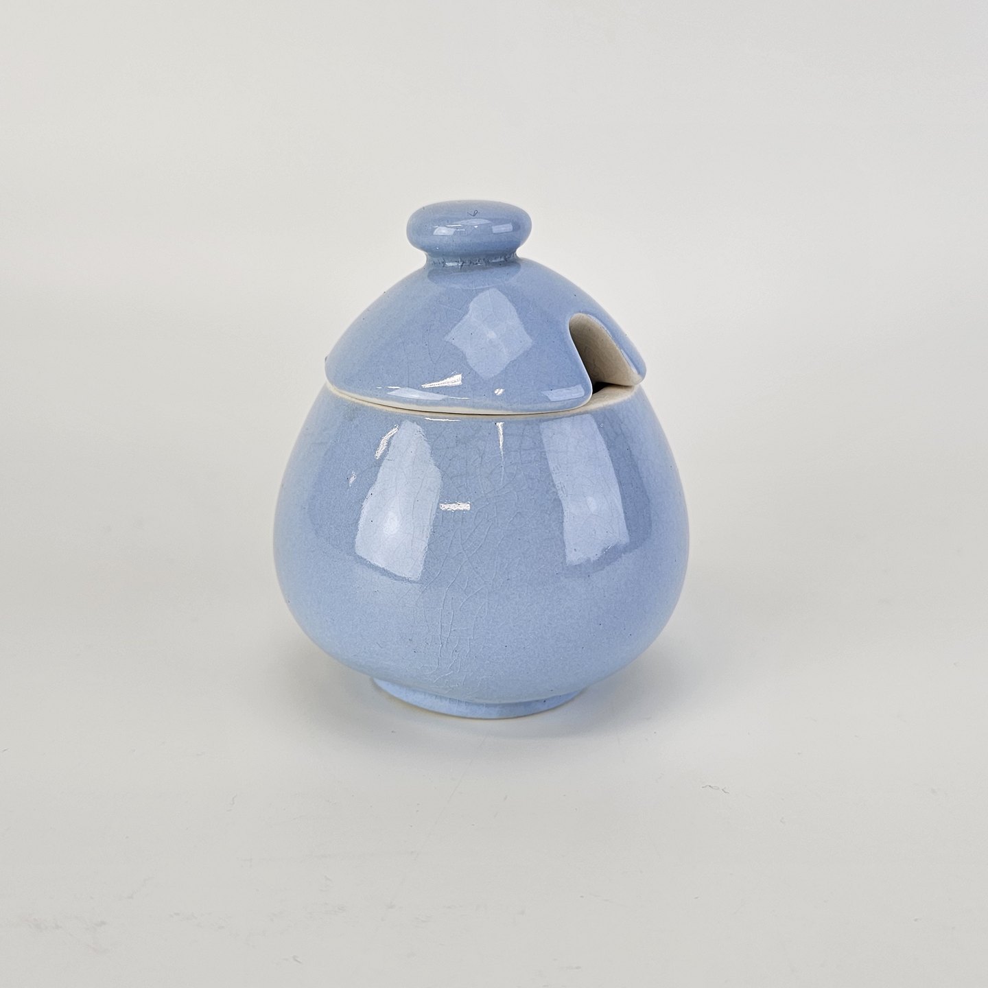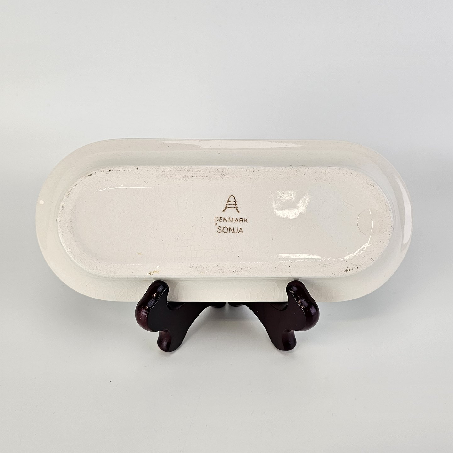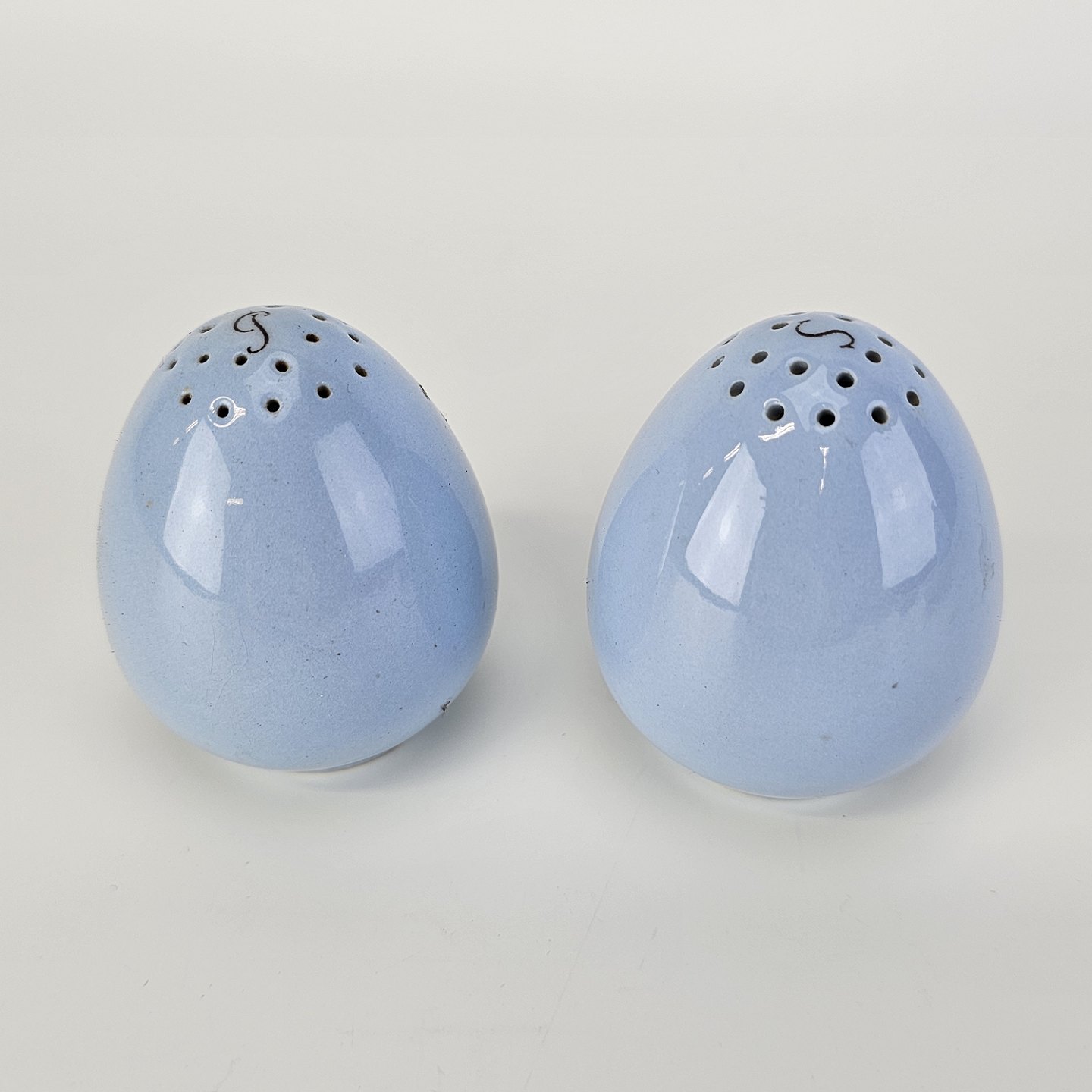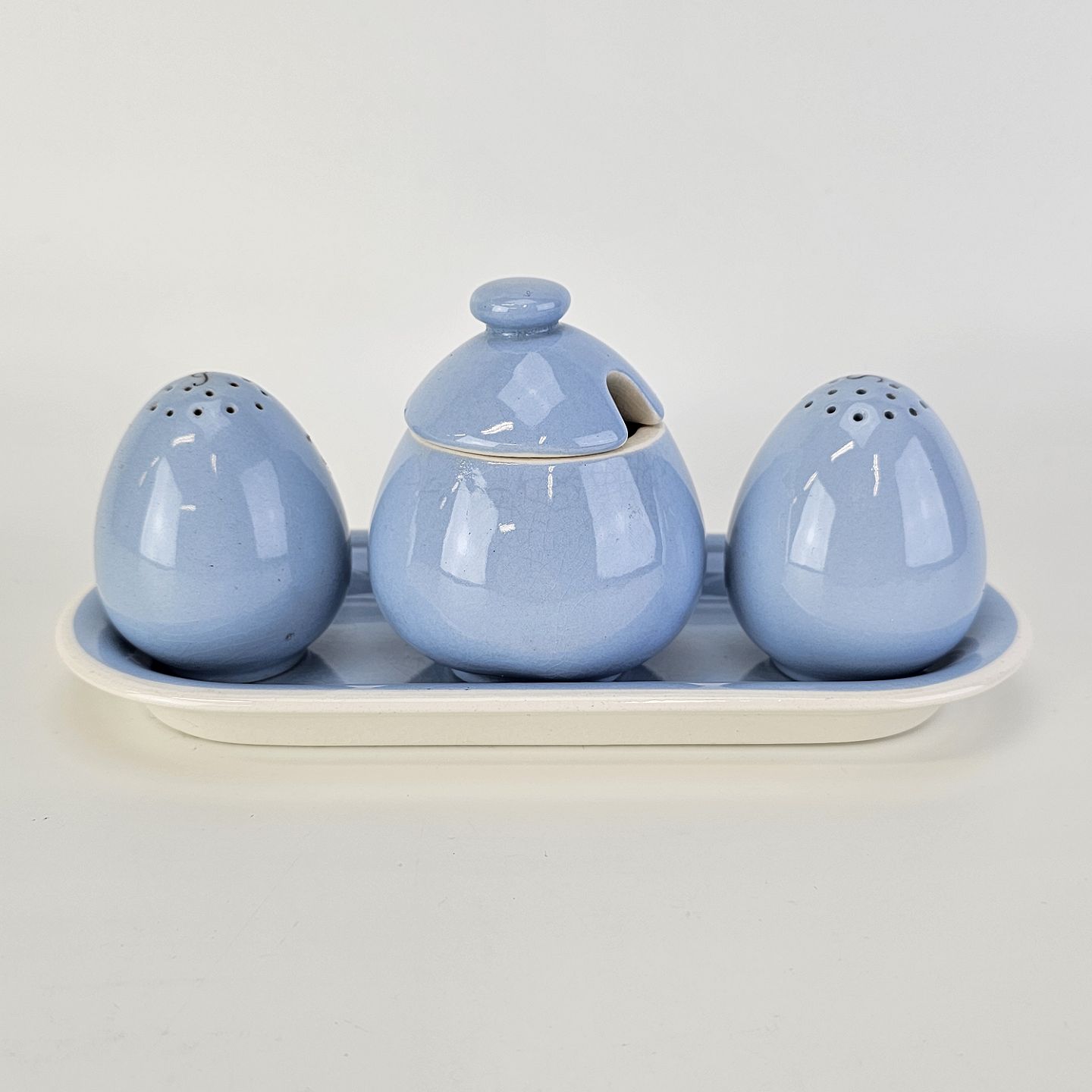 Salt, peber og senneps sæt på tallerken i fajance fra stellet Sonja