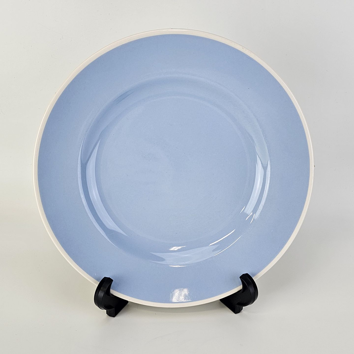Service i lyseblå fajance dekoreret med hvid kant