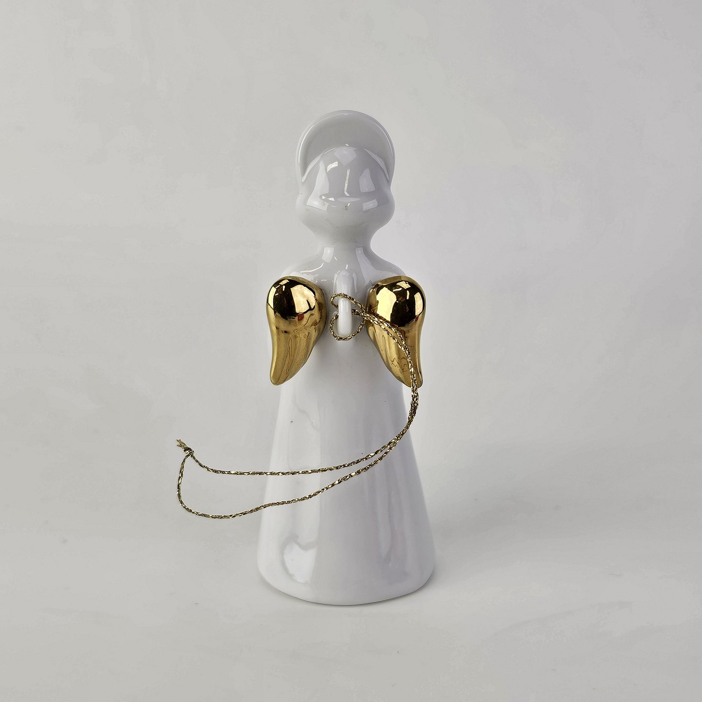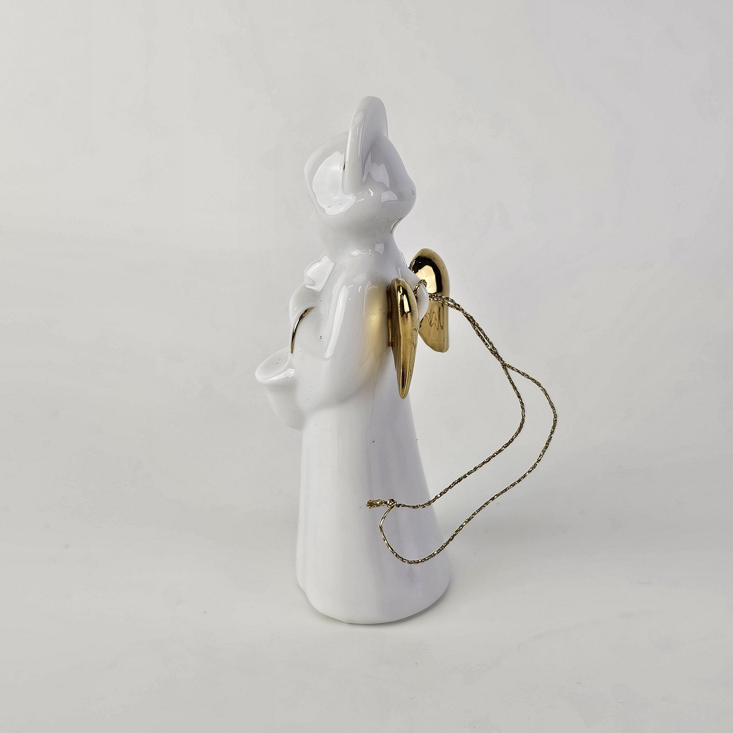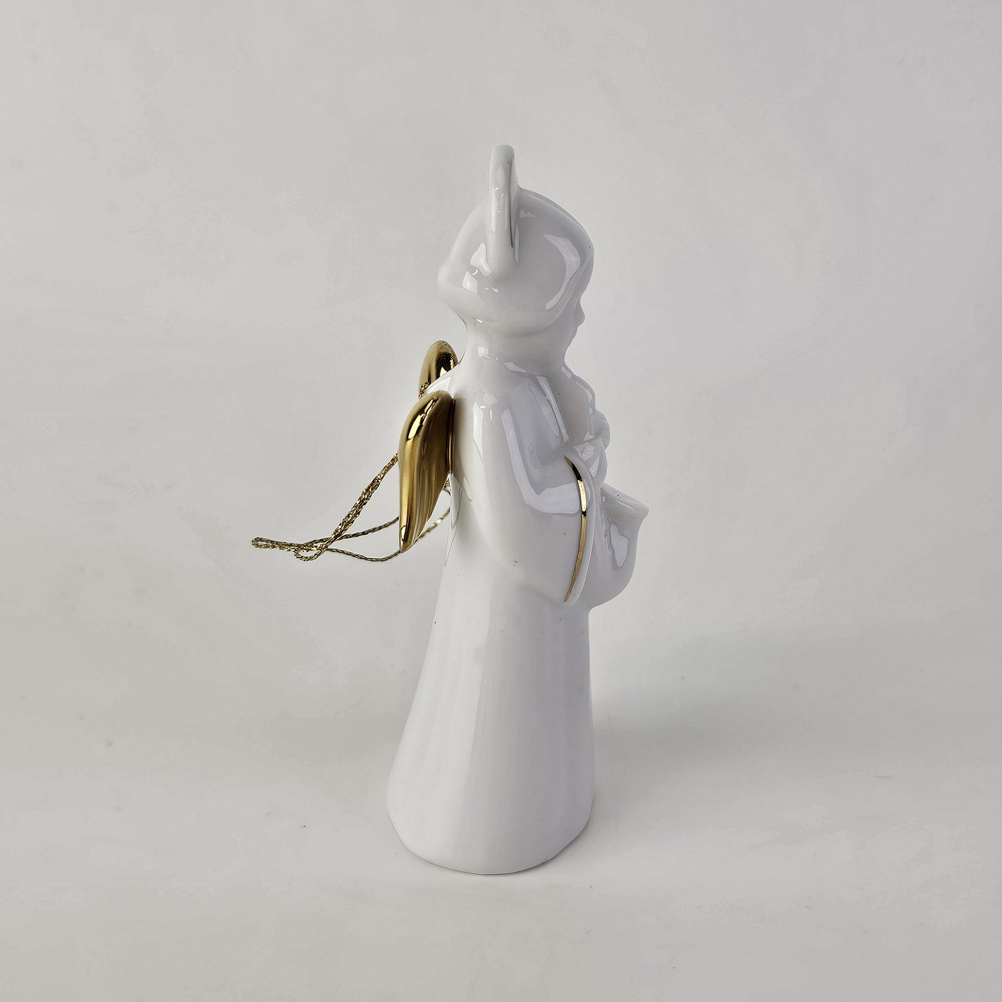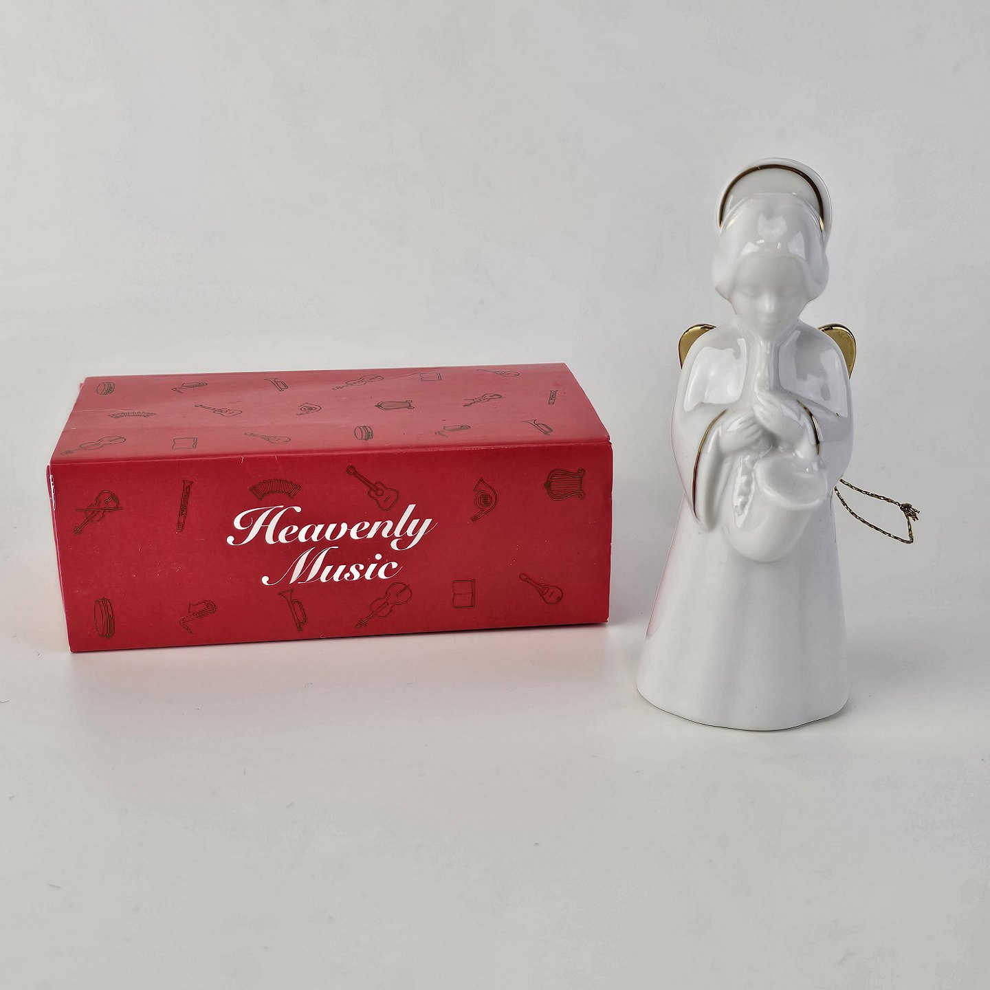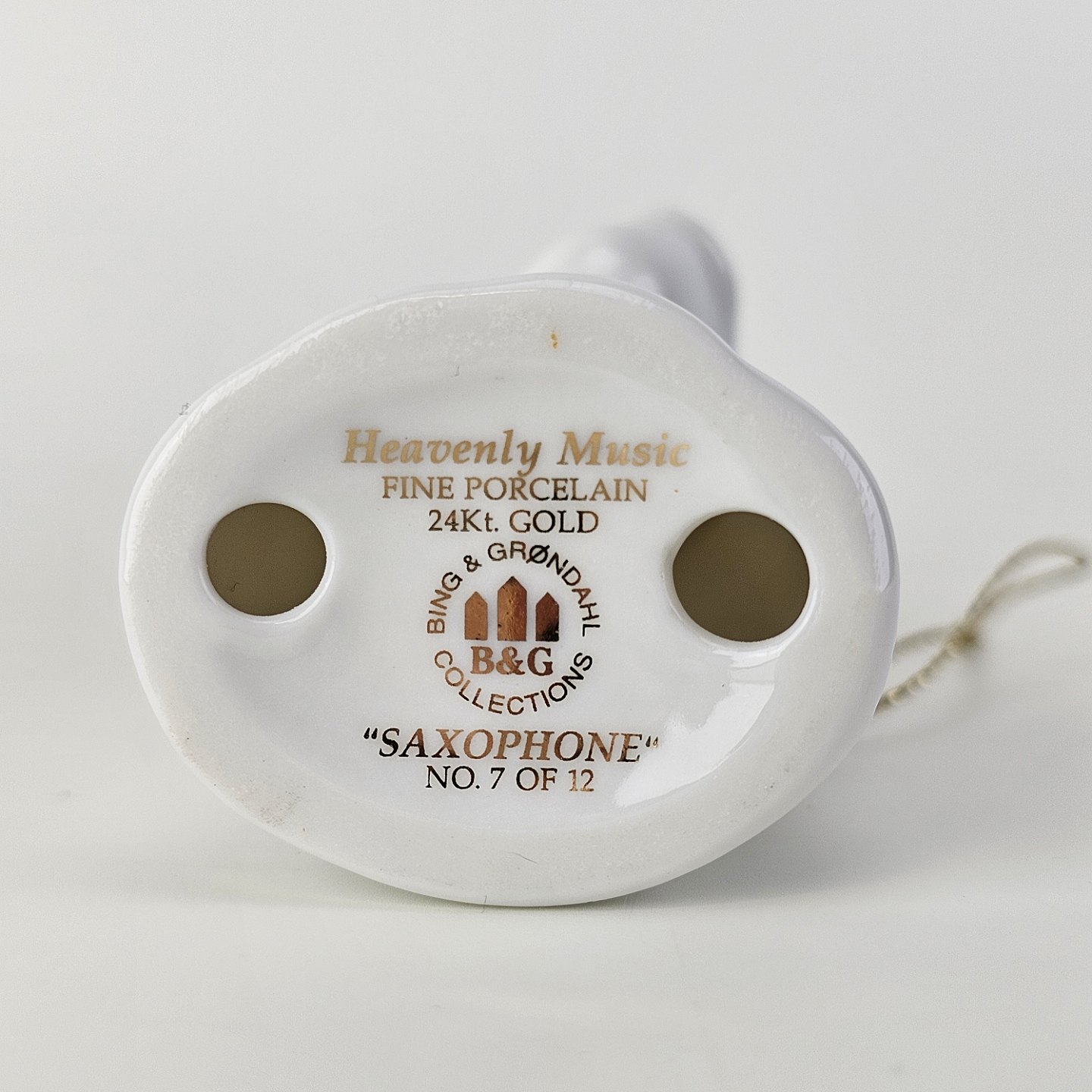Text zugänglich auf Dänische: Figur med motiv af en engel som spiller på saxofon. Figuren er i hvidt porcelæn med forgyldte vinger og detaljer i 24 karat guld.