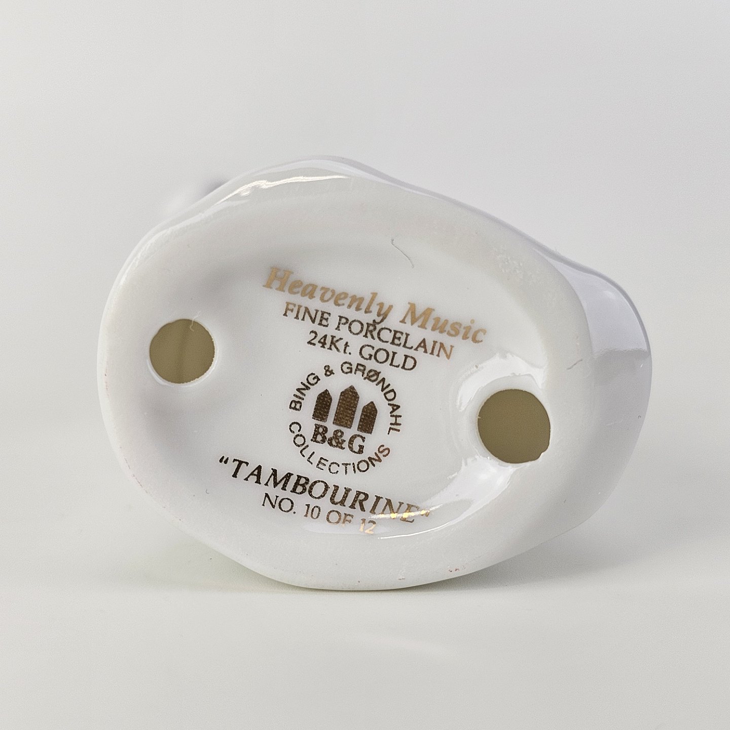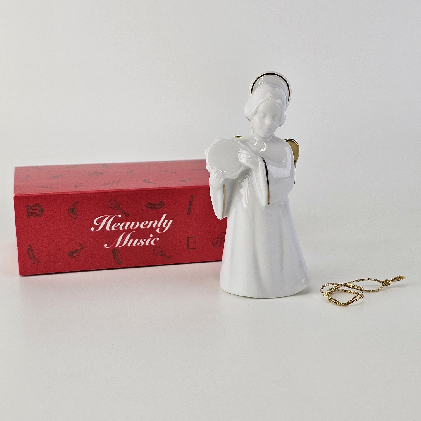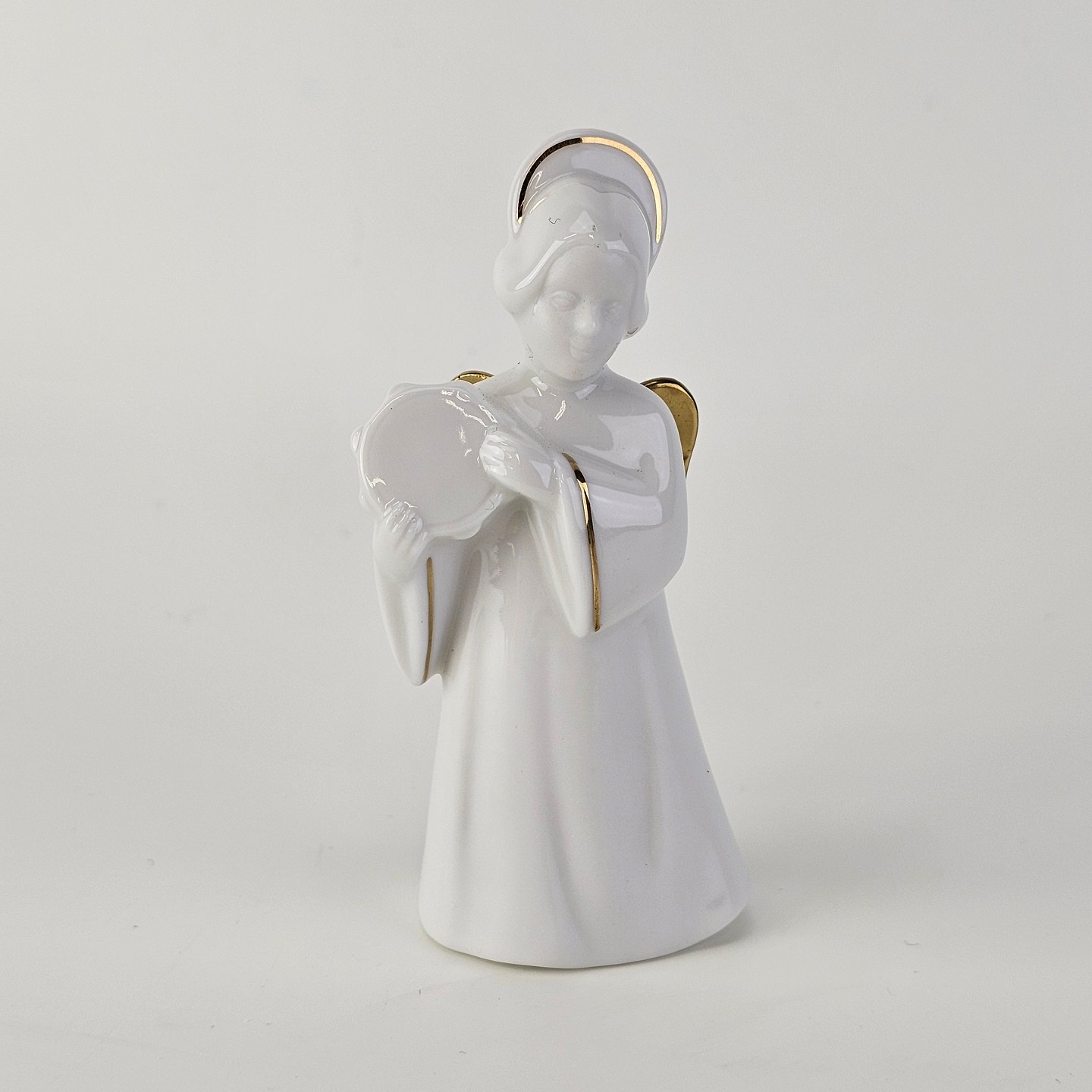 Text zugänglich auf Dänische: Figur med motiv af en engel med en tamburin. Figuren er i hvidt porcelæn med forgyldte vinger og detaljer i 24 karat guld.