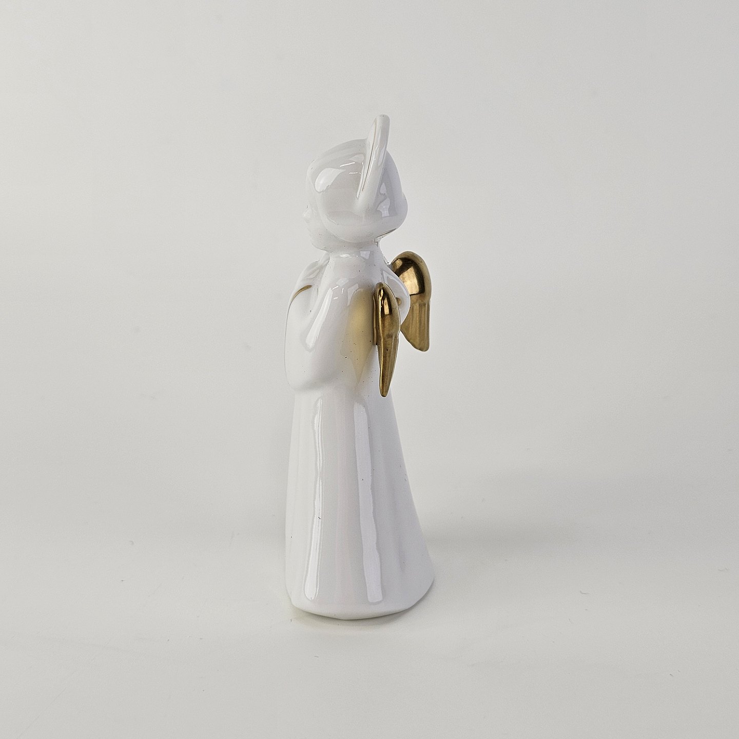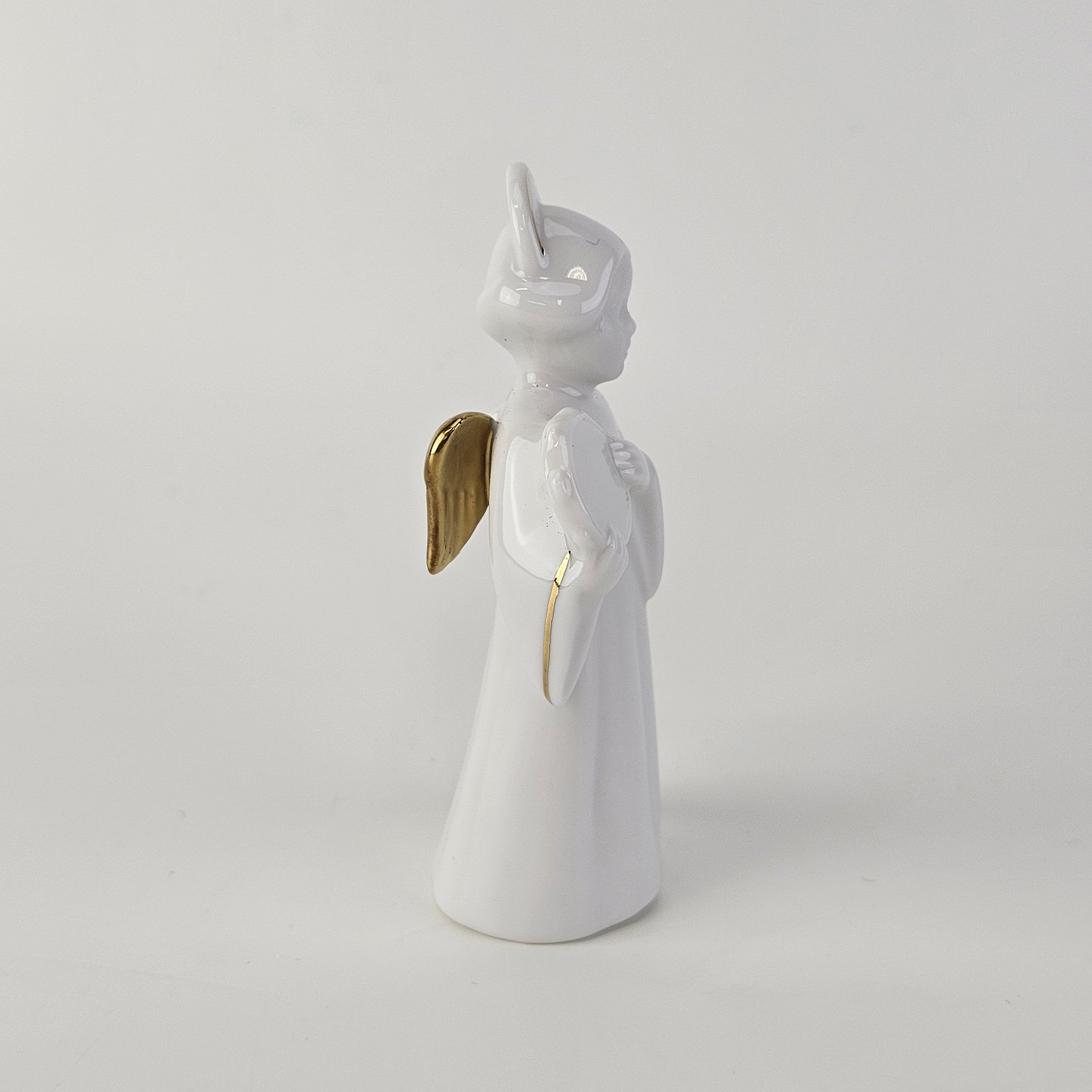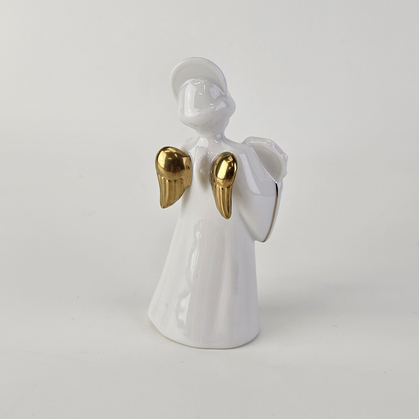 Text zugänglich auf Dänische: Figur med motiv af en engel med en tamburin. Figuren er i hvidt porcelæn med forgyldte vinger og detaljer i 24 karat guld.