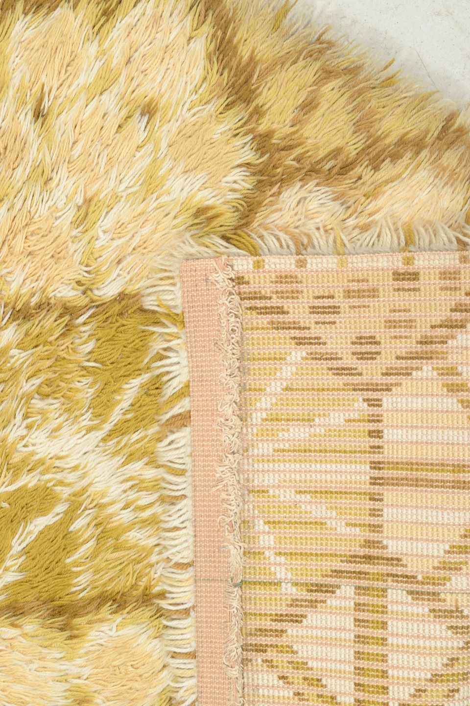 Håndknyttet rya-tæppe i uld designet af Marianne Richter, med geometrisk mønster i gyldne, beige og olivengrønne toner. Et raffineret eksempel på svensk tekstilkunst, hvor modernistiske former kombineres med varme, naturlige farver.