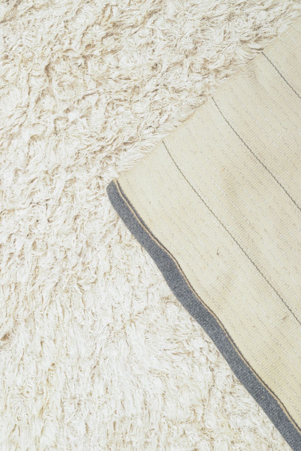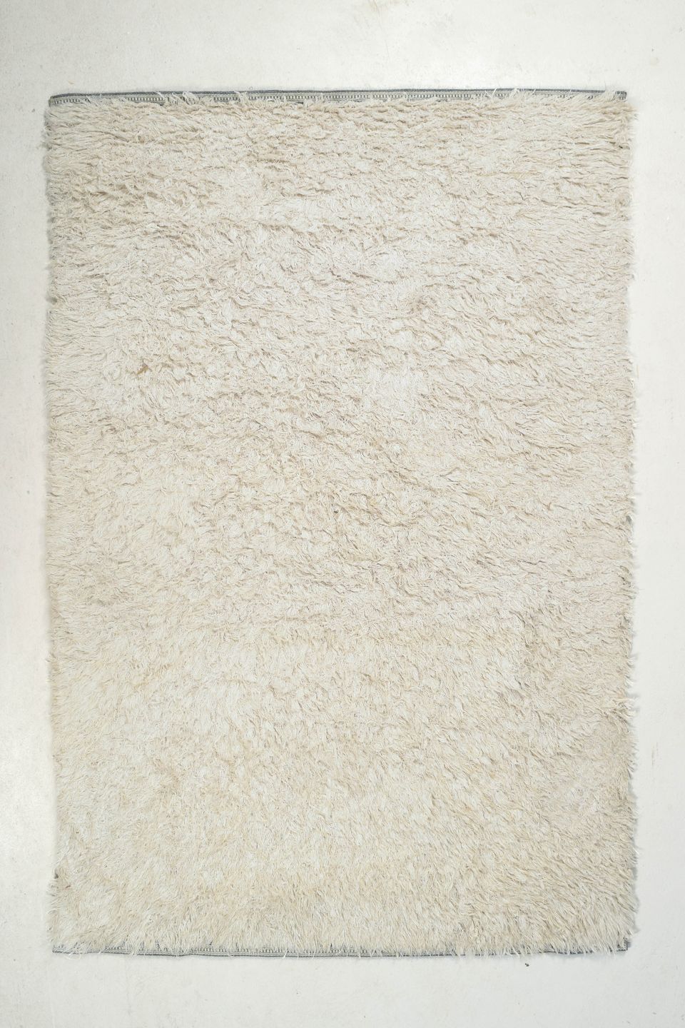 Håndknyttet rya-tæppe i naturhvid uld med tæt, blød luv. Et minimalistisk og elegant design, typisk for skandinavisk indretning i perioden, hvor materialets struktur og taktilitet blev sat i fokus frem for mønster.