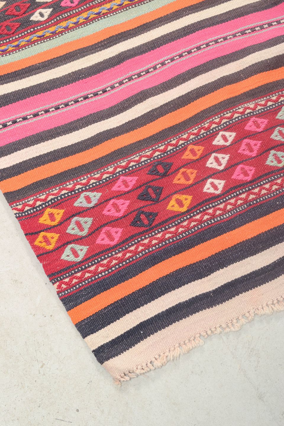 Håndvævet kelim tæppe i 100 % bomuld med geometrisk mønster i flerfarvede striber i røde, orange, rosa og blå nuancer. Et dekorativt vintage tekstilstykke med klassisk folkelig karakter.