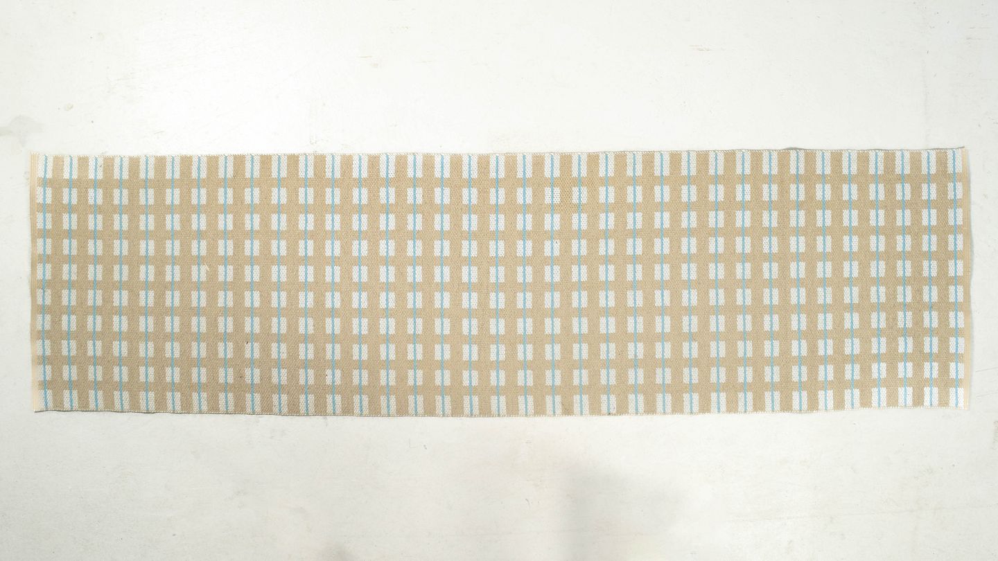 Rektangulær bordløber i vævet plast med grafisk mønster i beige og lyseblå nuancer, typisk for 1970’ernes funktionelle og farveglade interiørdesign.