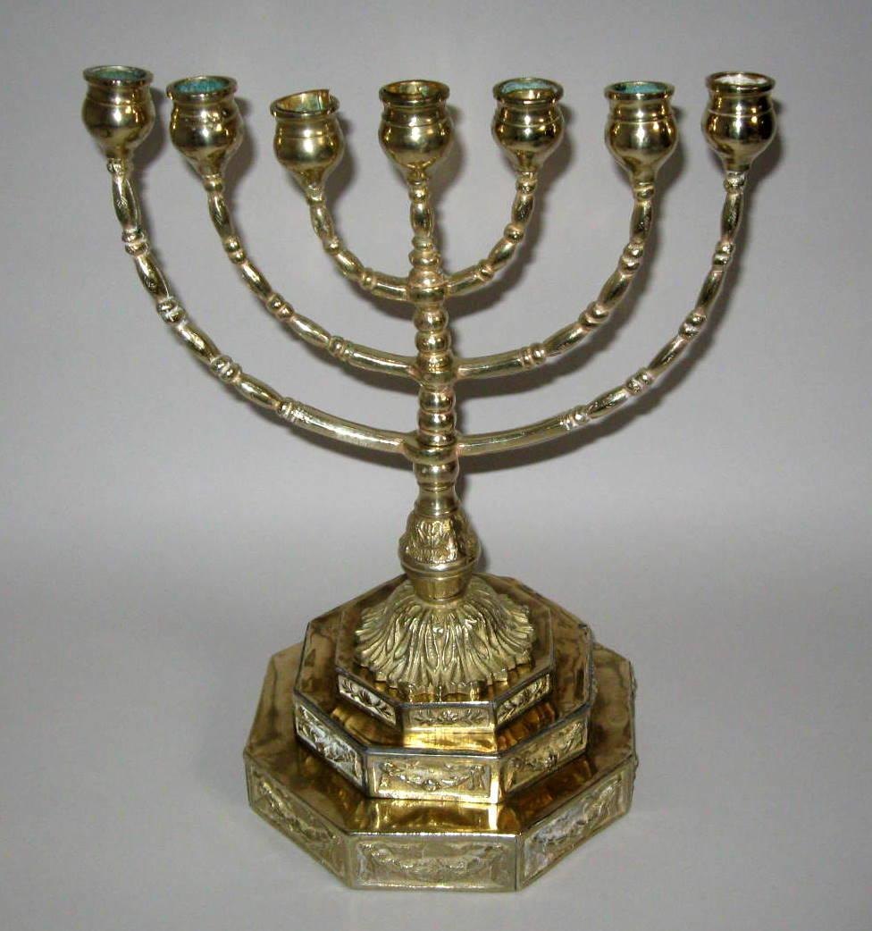 7 armige Leuchter aus Messing / Bronze, ca.1900. Mit achteckiger Basis mit Dekorationen von Girlanden. Profilierte Stamm. Kerzenleuchter enthaltet Symbolik aus sowohl den Alten und den Neuen Testament.