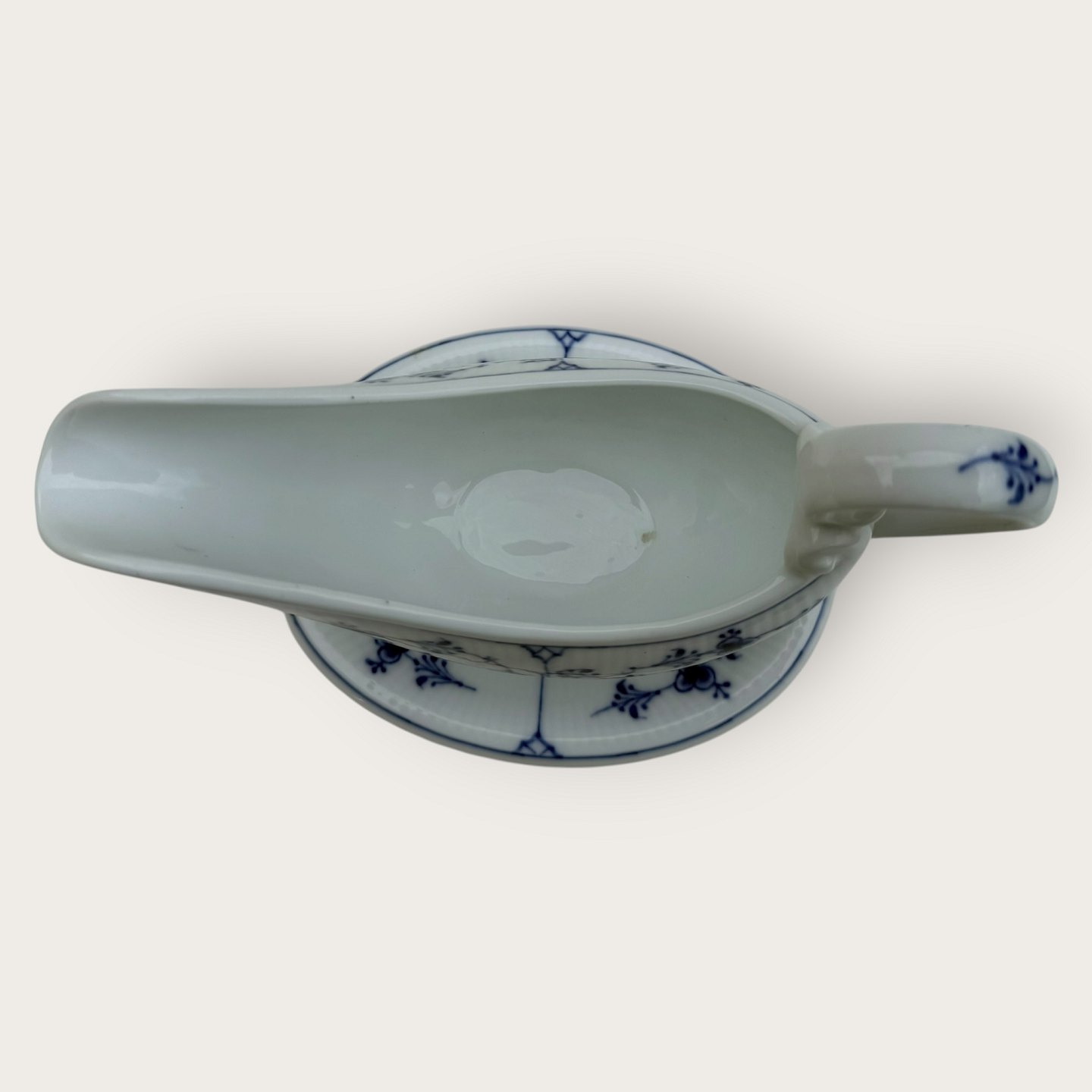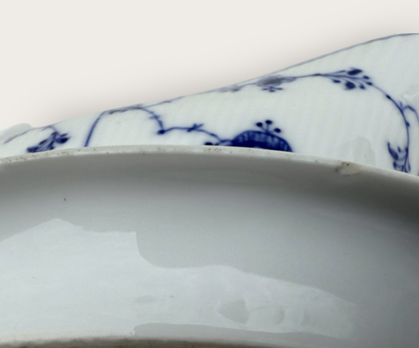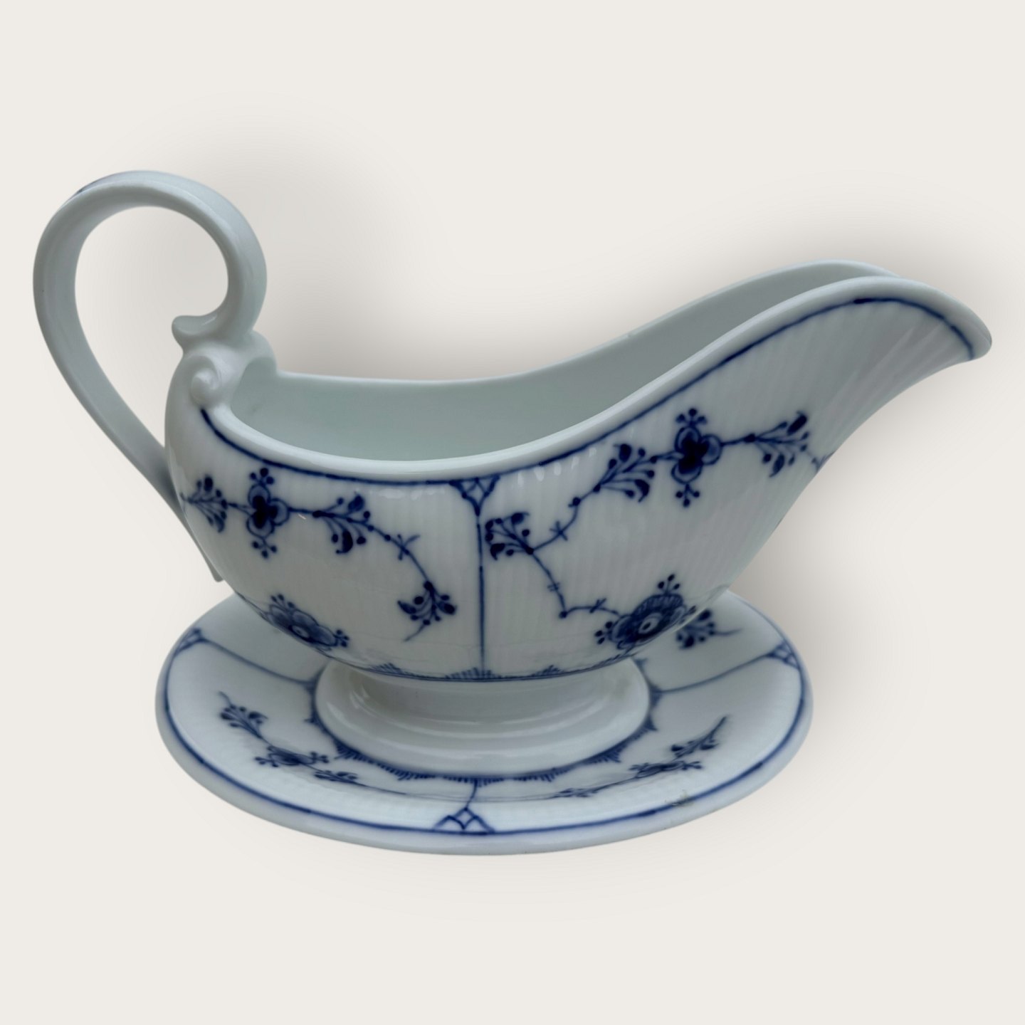 | Royal Copenhagen, blau geriffelte Saucenkanne auf festem Fuß, Nr. 1/200, Maße ca. H x B x T 10 x 20 x 13 cm, hergestellt zwischen 1894 und 1900. * Mit 2 sehr kleinen Absplitterungen unterhalb des Fußrandes (siehe die letzten 2 Fotos), ansonsten in gutem, gebrauchtem Zustand.