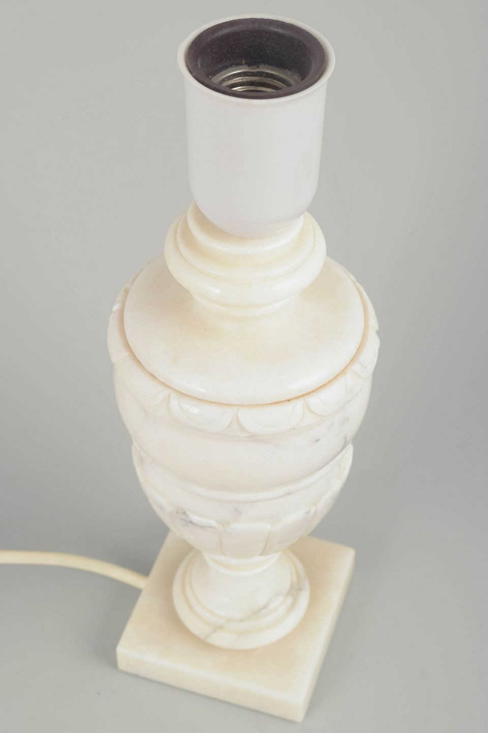 Elegant klassisk formet bordlampe udført i håndskåret alabast med kvadratisk fod og fint udskårne detaljer. Lampens varme hvide sten og bløde overflade fremhæver materialets naturlige årer og translucente skær.