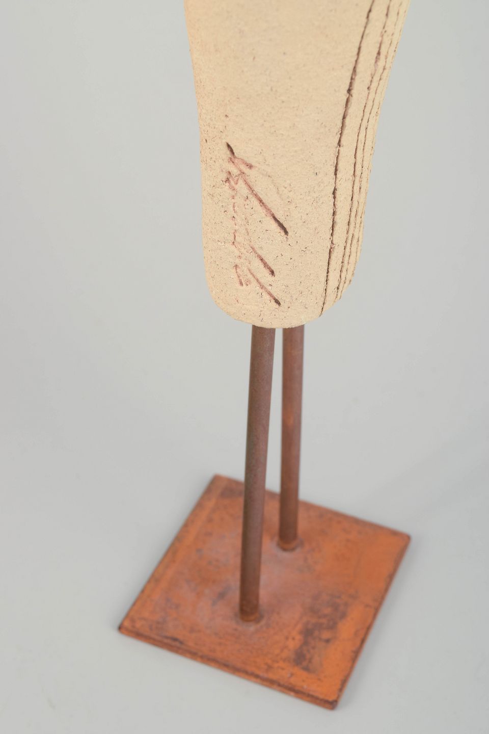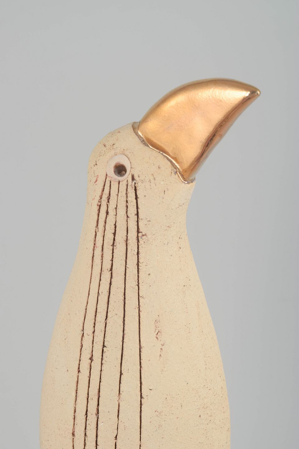 Elegant fugleformet skulptur i håndformet stentøj med lys, let ru overflade og indgraverede linjer, monteret på metalben med base i jern. Næbbet i metallisk glasur skaber en markant kontrast til den matte krop. Signeret af kunstneren.