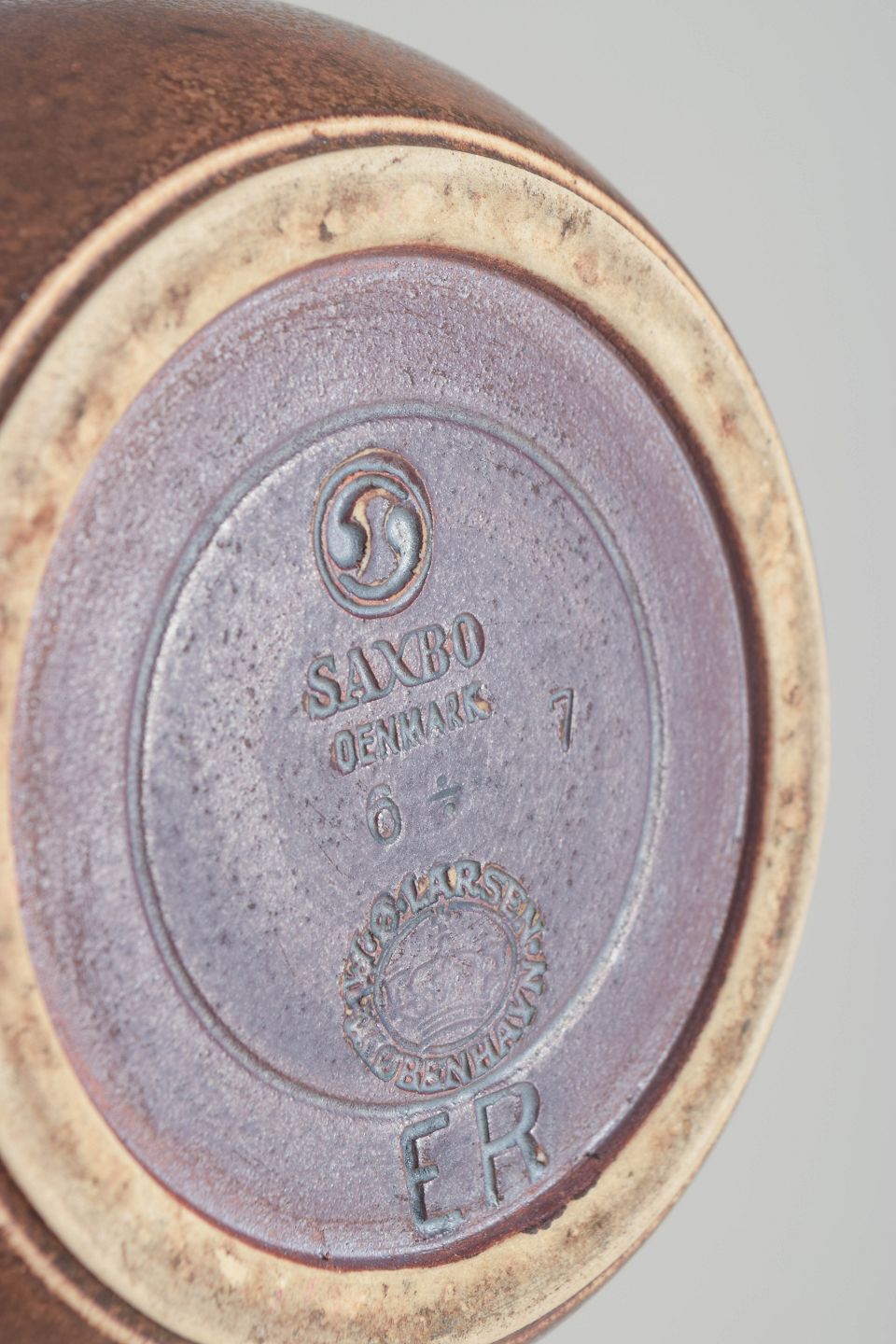 Organisk formet lågkrukke i stentøj med mat brun glasur i varme jordtoner. Låget har to små greb, typisk for Saxbos funktionelle og skulpturelle formsprog. Et enkelt og harmonisk eksempel på Rahrs arbejde for Saxbo.
