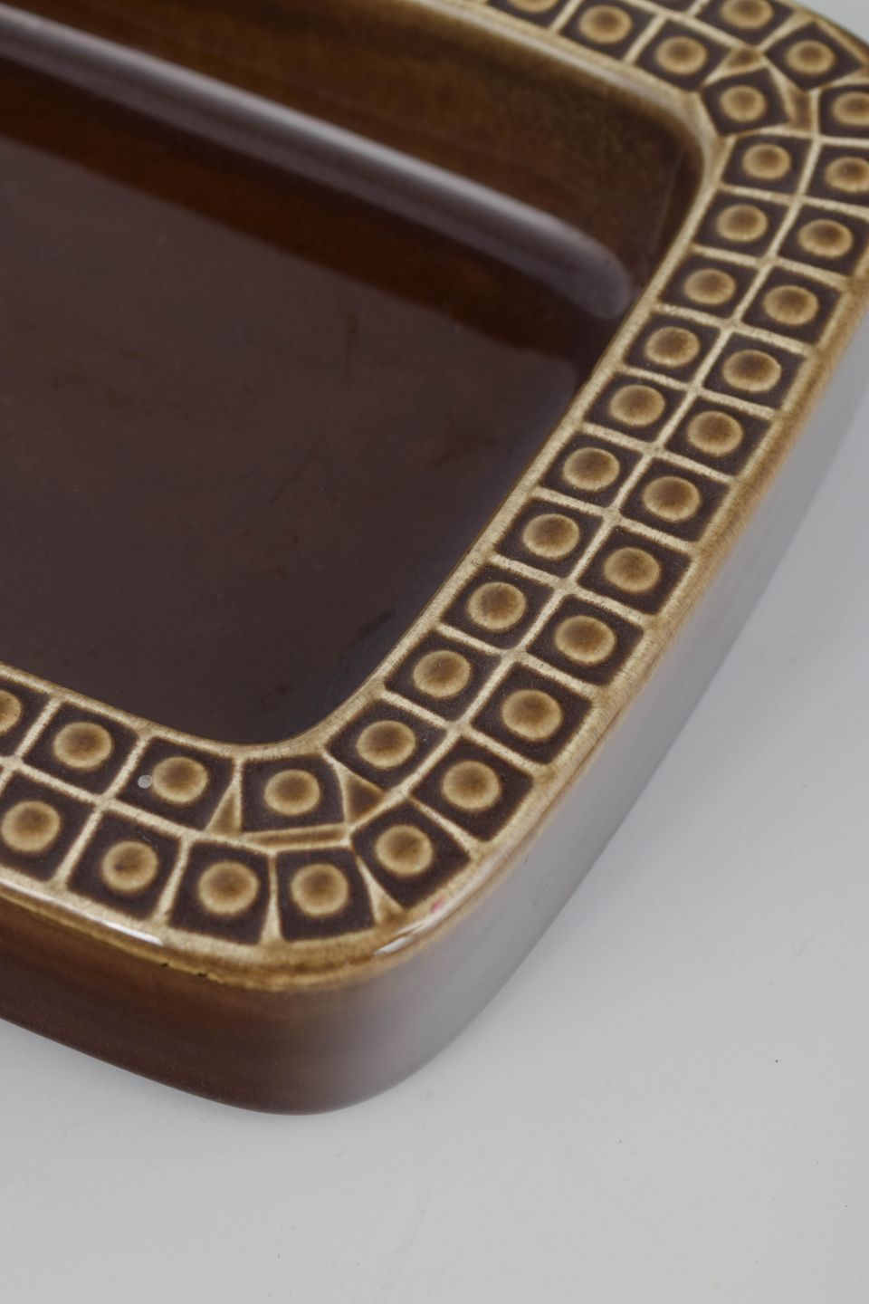 Keramisk skål i brun glasur med karakteristisk geometrisk reliefmønster langs kanten. Serien Kub forener funktionalisme og modernistisk elegance, og dette design er et fint eksempel på Nylunds sans for proportioner og materialefølelse.