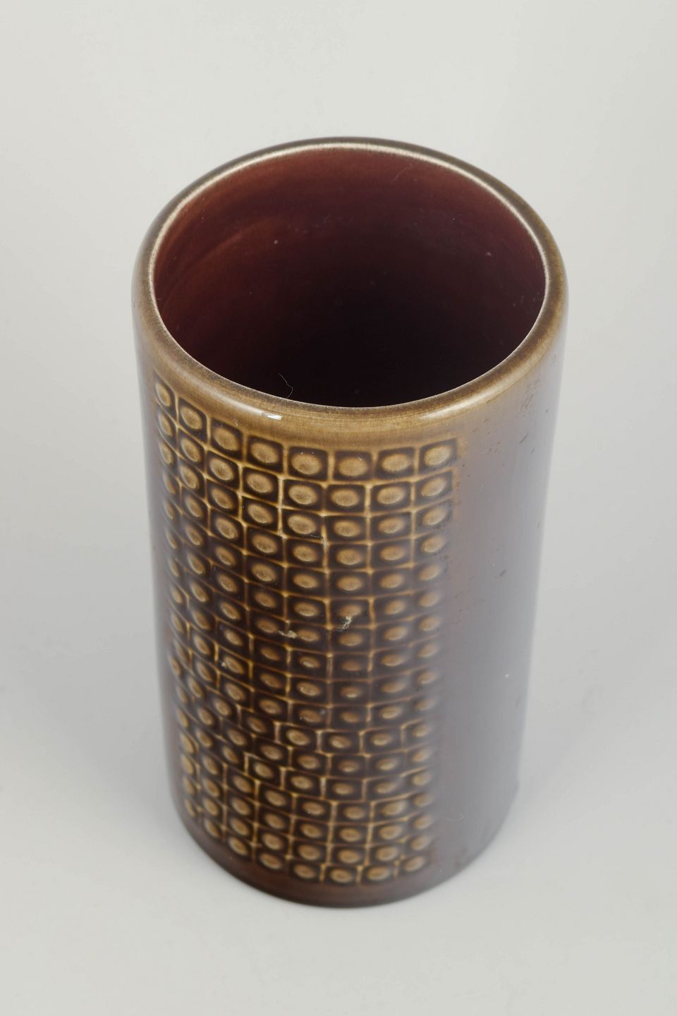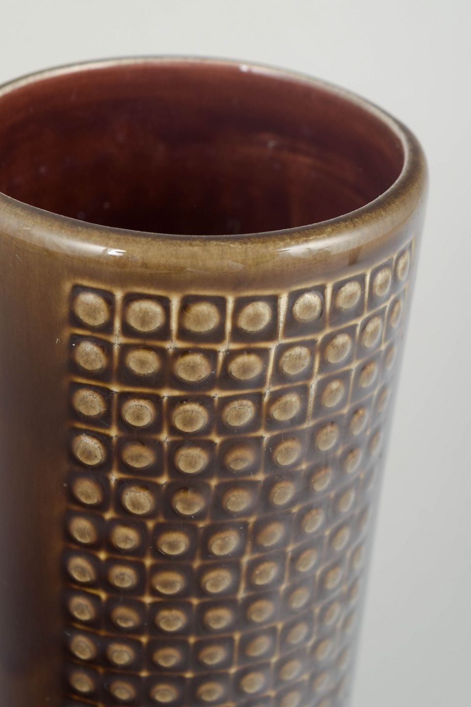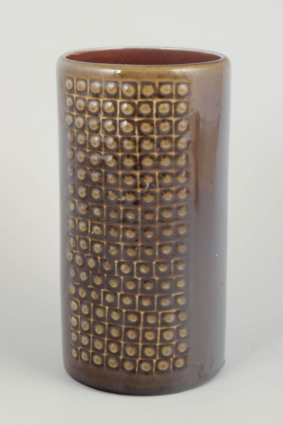 Cylinderformet vase i stentøj med karakteristisk reliefmønster af kvadratiske felter og brun glasur med gyldne nuancer. Et klassisk eksempel på Nylunds moderne formsprog fra 1960’erne.