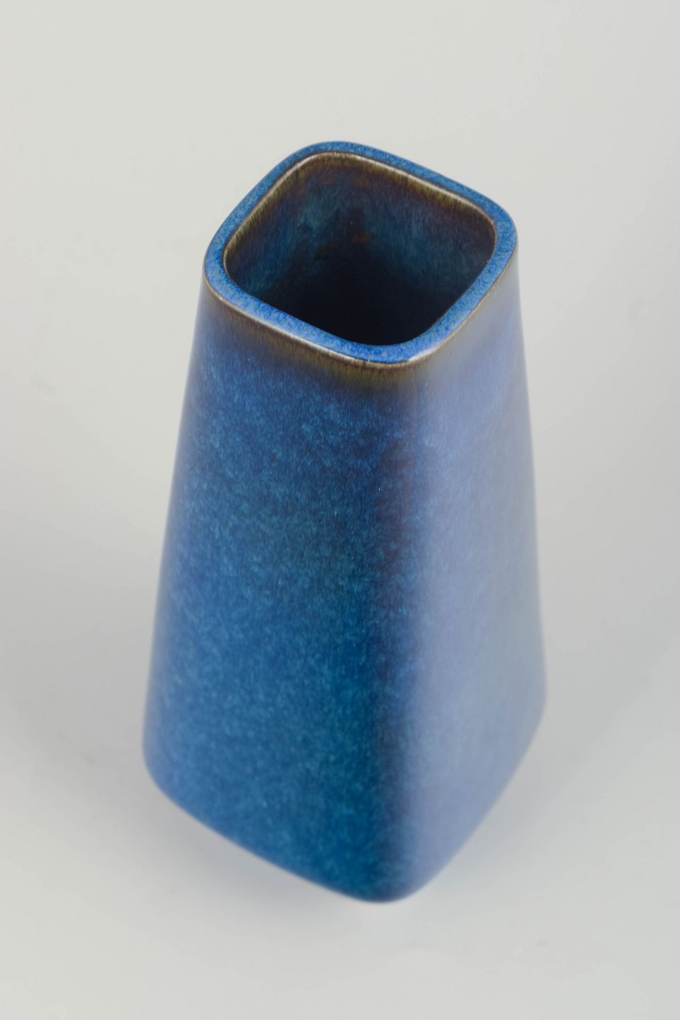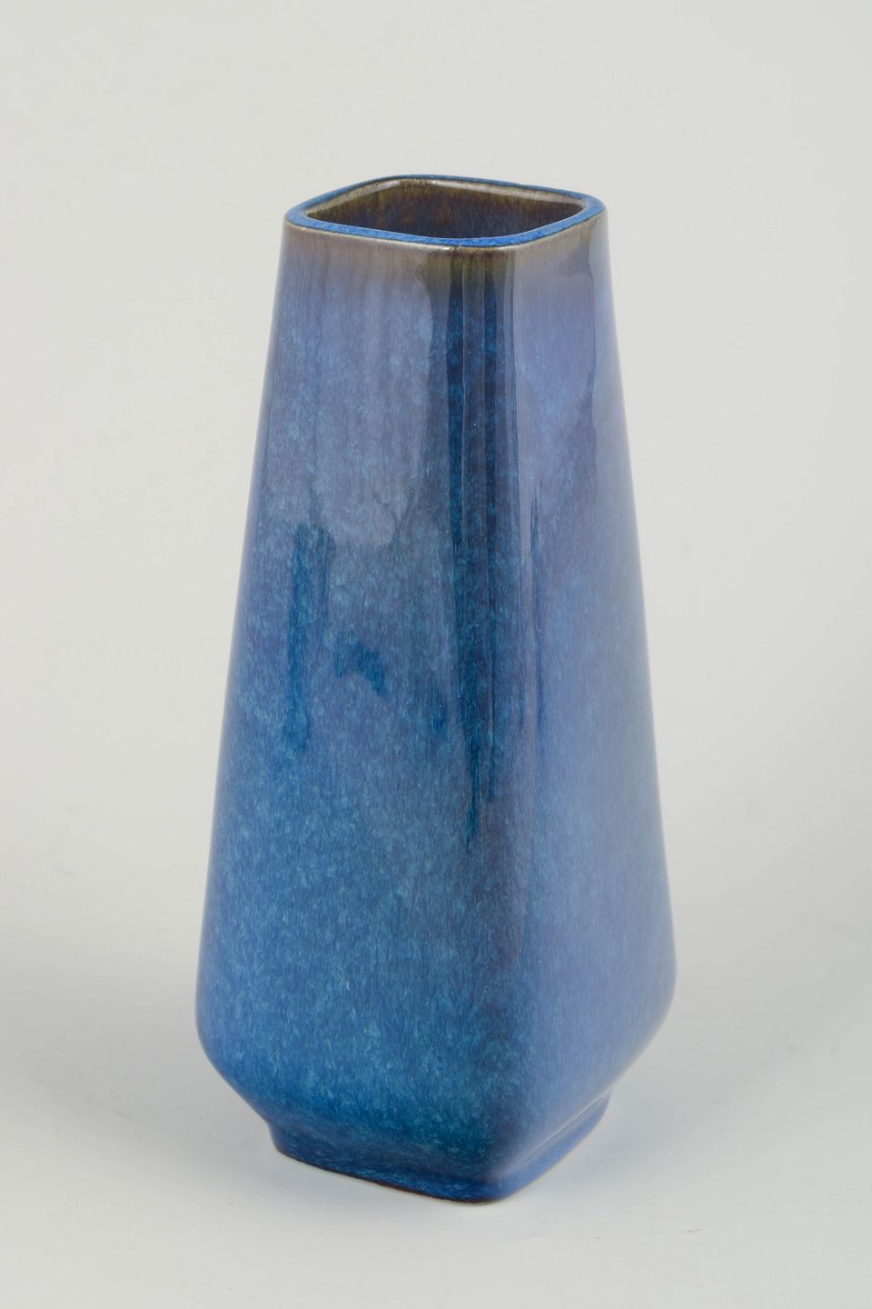Rektangulær vase i stentøj med håndpåført blå laguneglasur i levende nuancer af azur, kobolt og gråtoner. Et klassisk eksempel på Gustavsbergs forfinede glasurarbejde fra perioden, hvor modernistiske former blev kombineret med dyb, sanselig farvevirkning.