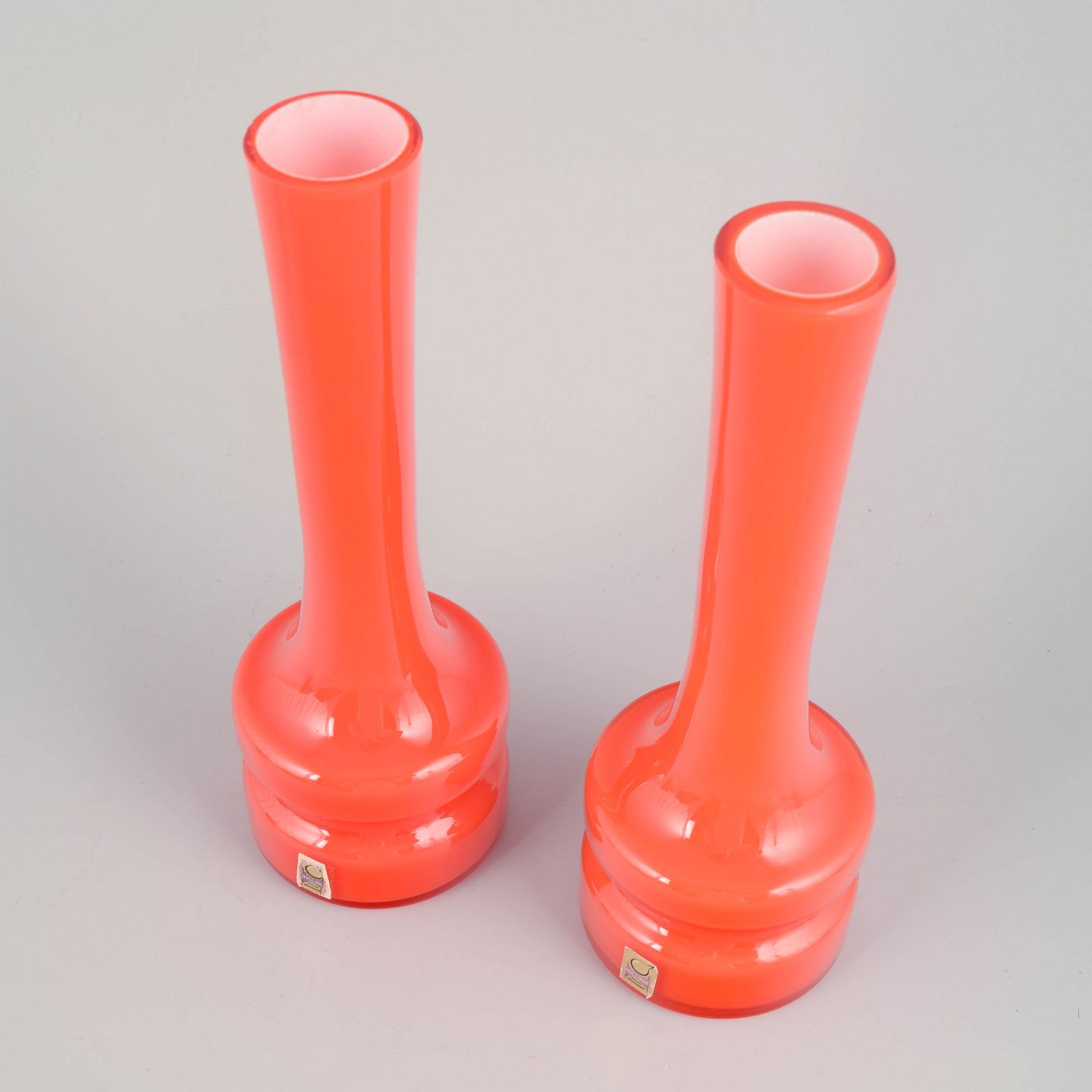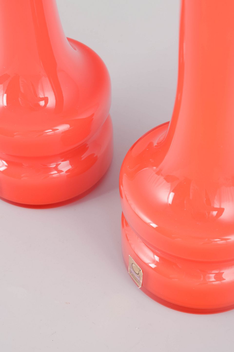 Et par mundblæste vaser i intens orange glas med markant, skulpturel fod og slank, udtrukket hals. Typiske for Hyllinge Glas’ produktion i 1970’erne, hvor farvestærke, geometriske former dominerede udtrykket.