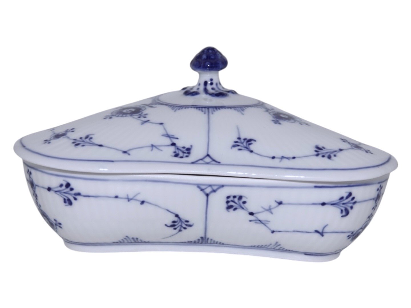 Royal Copenhagen Musselmalet Riflet, lille og sjælden trekantet skål med låg.
