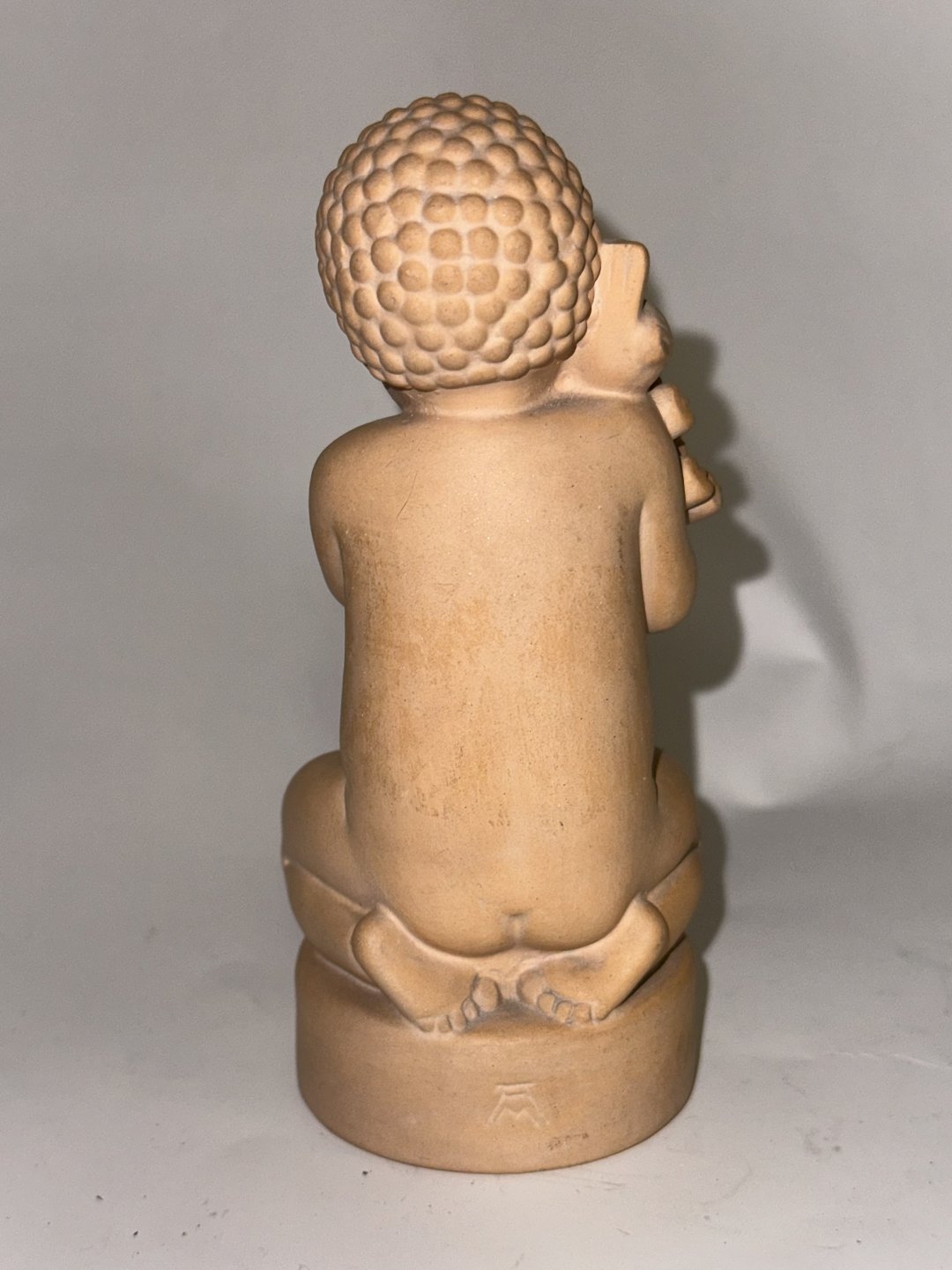 Figur af dreng i keramik. Udført af Arno Malinowski for Peter Ipsens Enke. Fabriksmærket på bunden. Kunstner monogram på bagsiden af soklen. Fremstår i perfekt stand. H. 12,7 cm