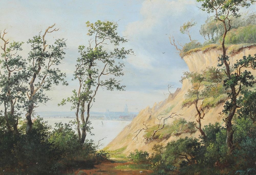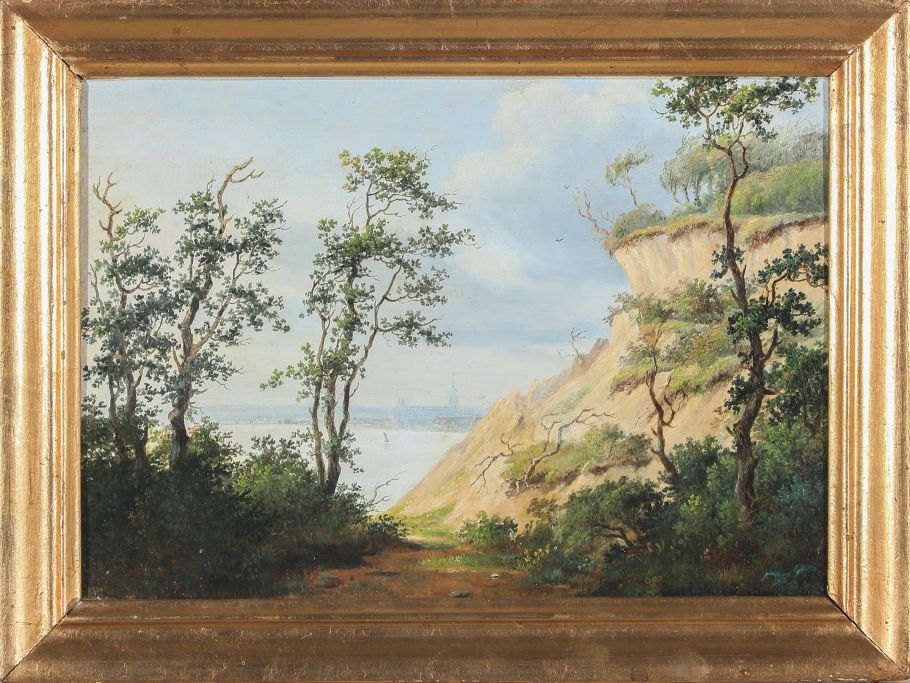 Holm, Peter (1798–1875). Dänemark. Sommerlandschaft mit der Bucht von Aarhus und der Stadt, gesehen von den Hängen des Risskov. Öl auf Metallplatte. Signiert P. Holm (ntv). 18 × 25 cm.