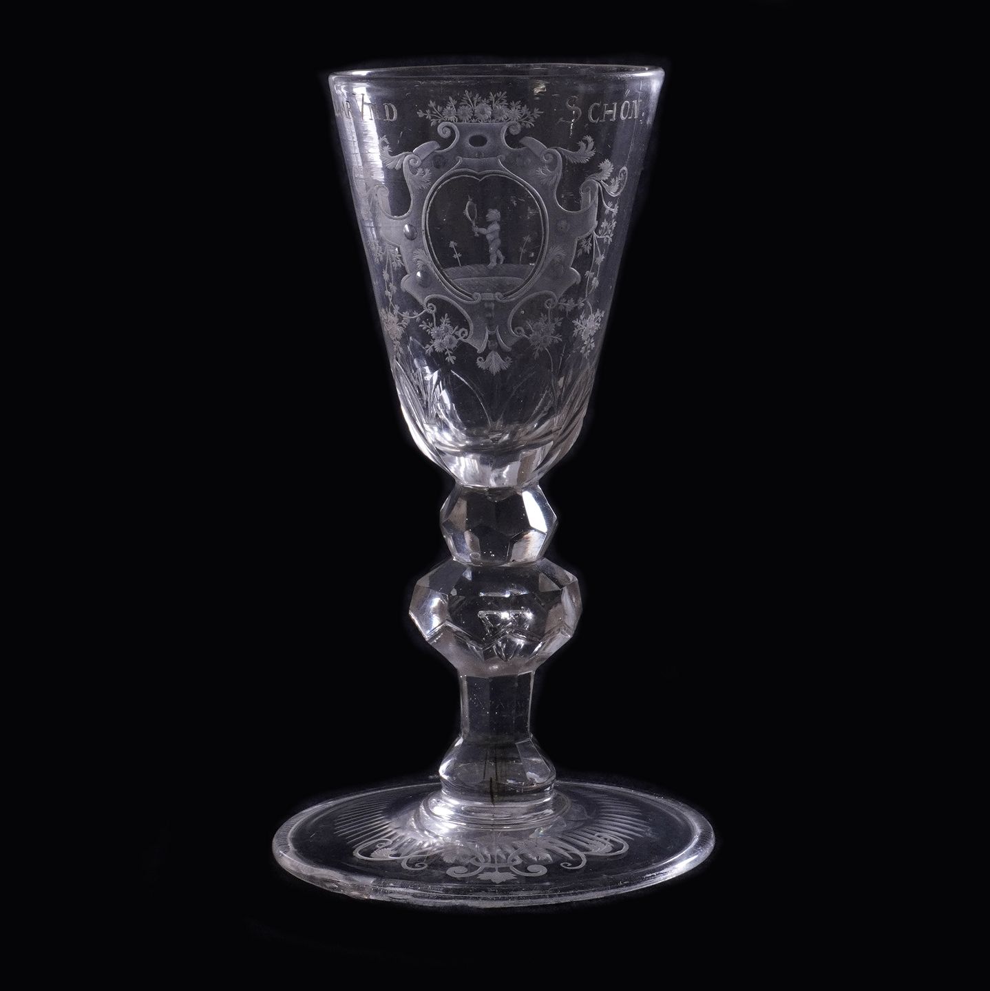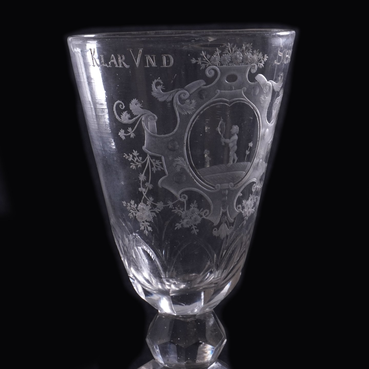 Deutscher Glaspokal mit der Gravur "Klar und Schön". Wahrsch. Sachsen um 1750. H: 20cm |