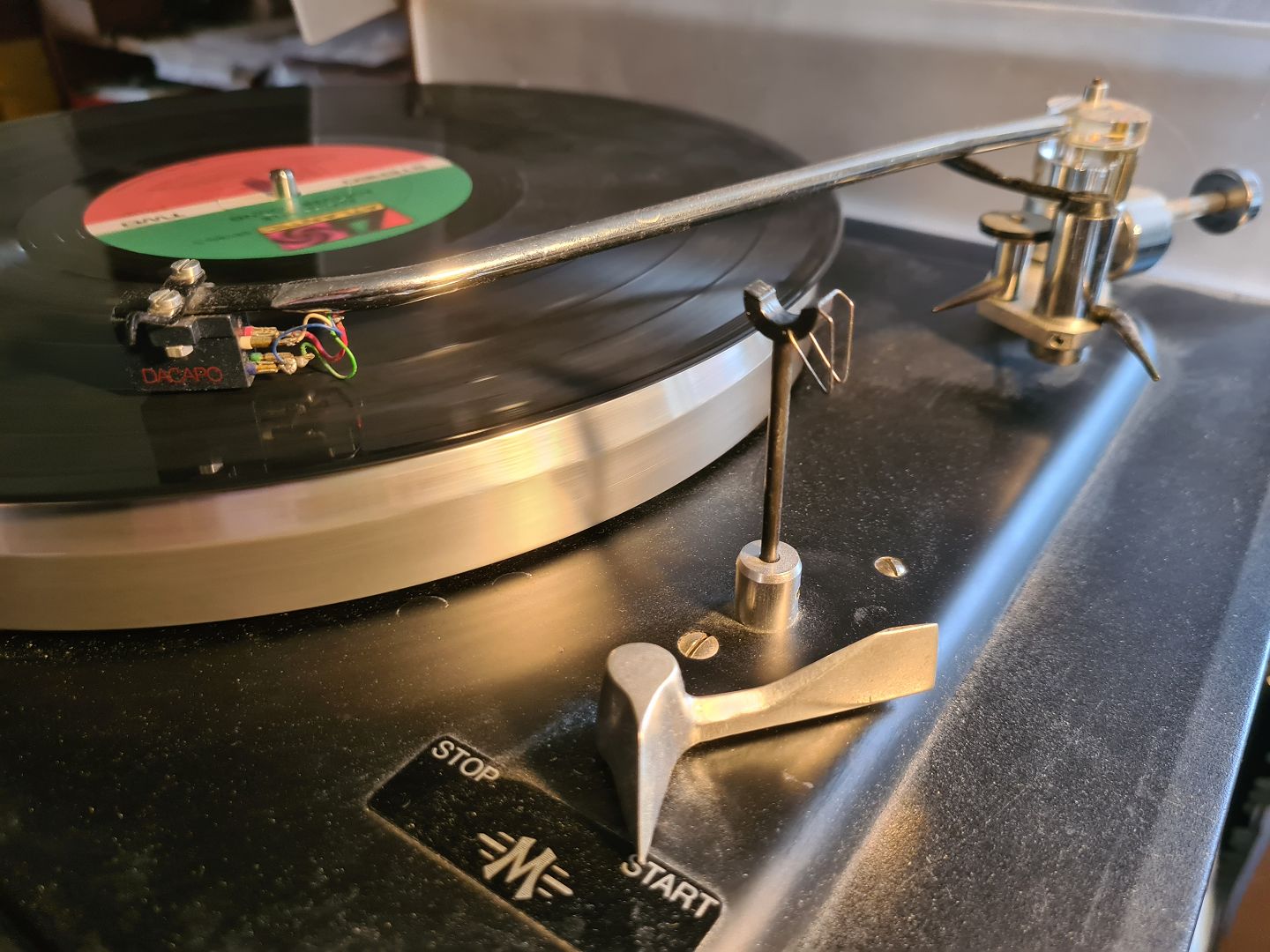 Vintage pladespiller H. H. Mørch model GS 6 i sort trækabinet. Testet og kører måske en anelse ujævnt hastighedsmæssigt, men starter ellers fint op. Hastighedsknop virker ligeledes fint. Kommer med Mørch tonearm model UP4 monteret med DACAPO pickup ligeledes fra Mørch. Derudover originalt cover.