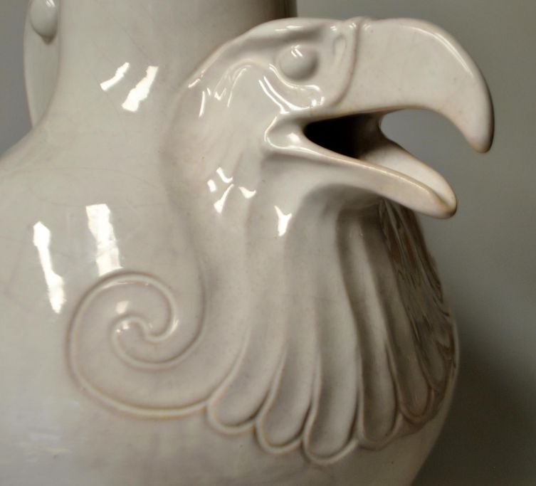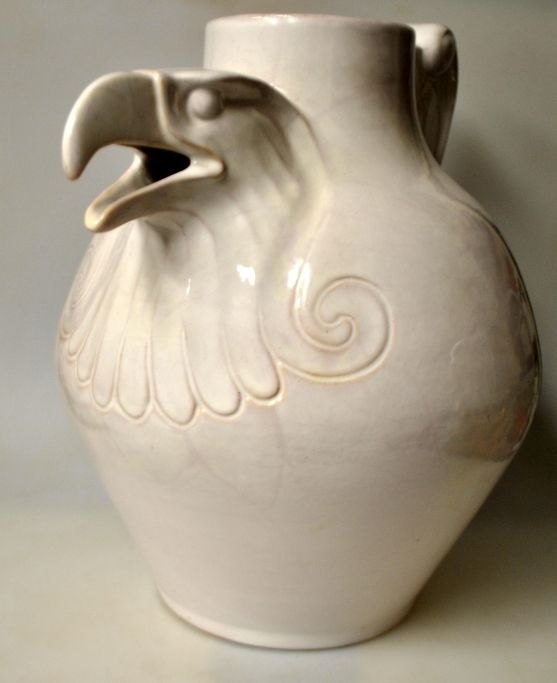 Hansen Reistrup, Karl (1863–1929), Dänemark: Steingutkanne in Adlerform. Hergestellt von HA Kähler, Næstved. Weiß glasiert. Mit speziell angefertigtem Henkel. Signiert: KHR und HAK. Höhe: 32,5 cm. Breite: 35 cm.