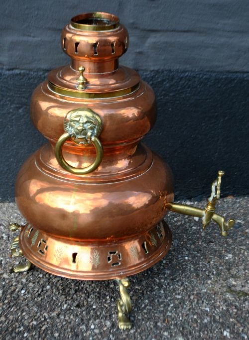 Teekocher aus Kupfer, Barock, 18. Jahrhundert. Dänemark. Beine, Griff und Hahn aus Messing. Verziert mit Löwenkopf und Löwenfüßen. Innen verzinnt. H: 41 cm. Durchmesser: 23,5 cm.