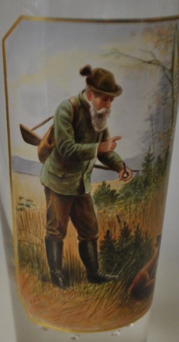 Deutsches Trinkglas, 19. Jahrhundert. Mit Jägermotiv in Aufglasurtechnik mit Emaille. Mit Vergoldung. H.: 17,5 cm.
