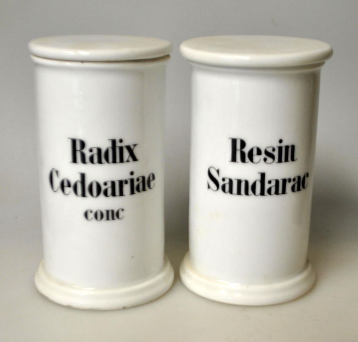 Paar Apothekergefäße aus Porzellan mit Deckel, 19. Jahrhundert.