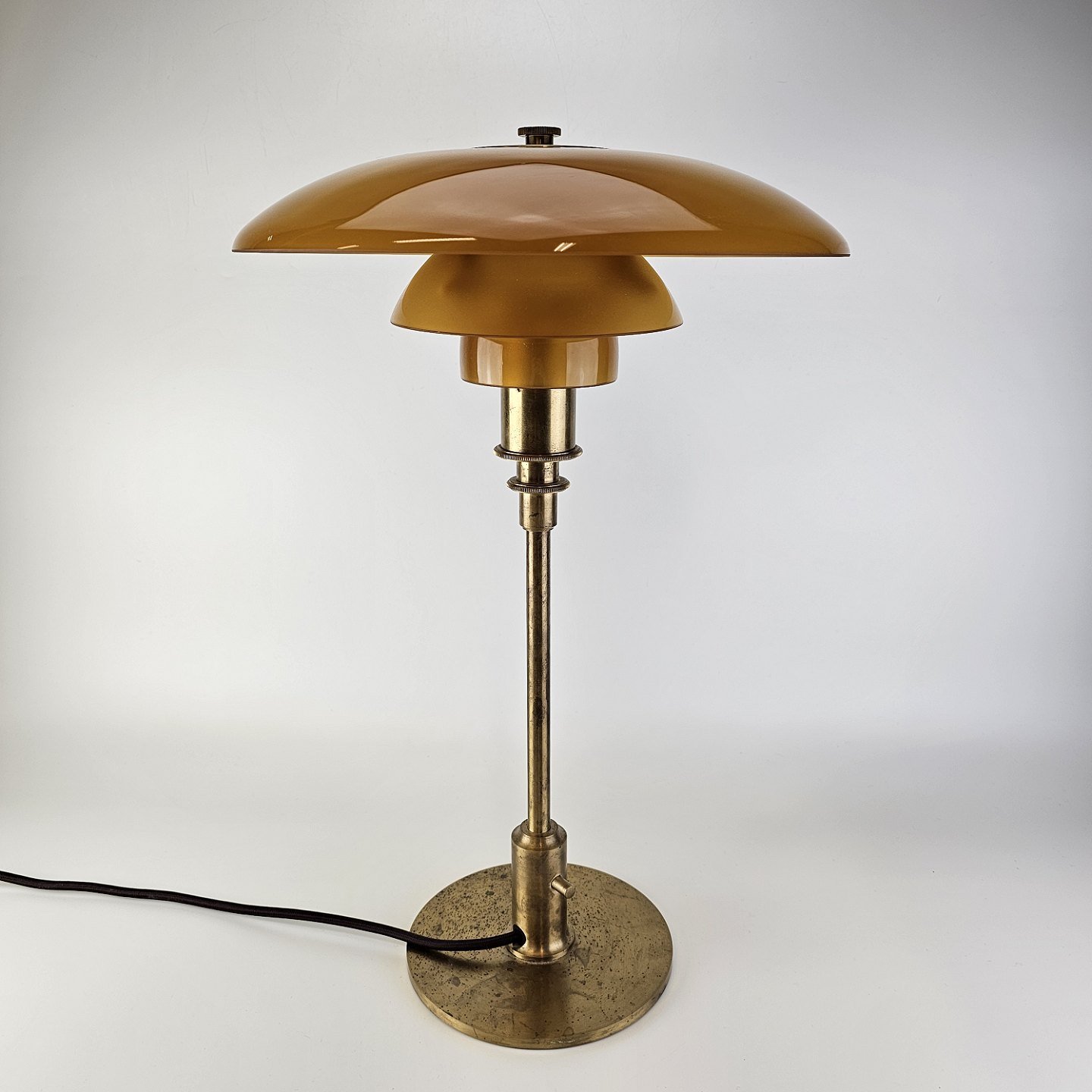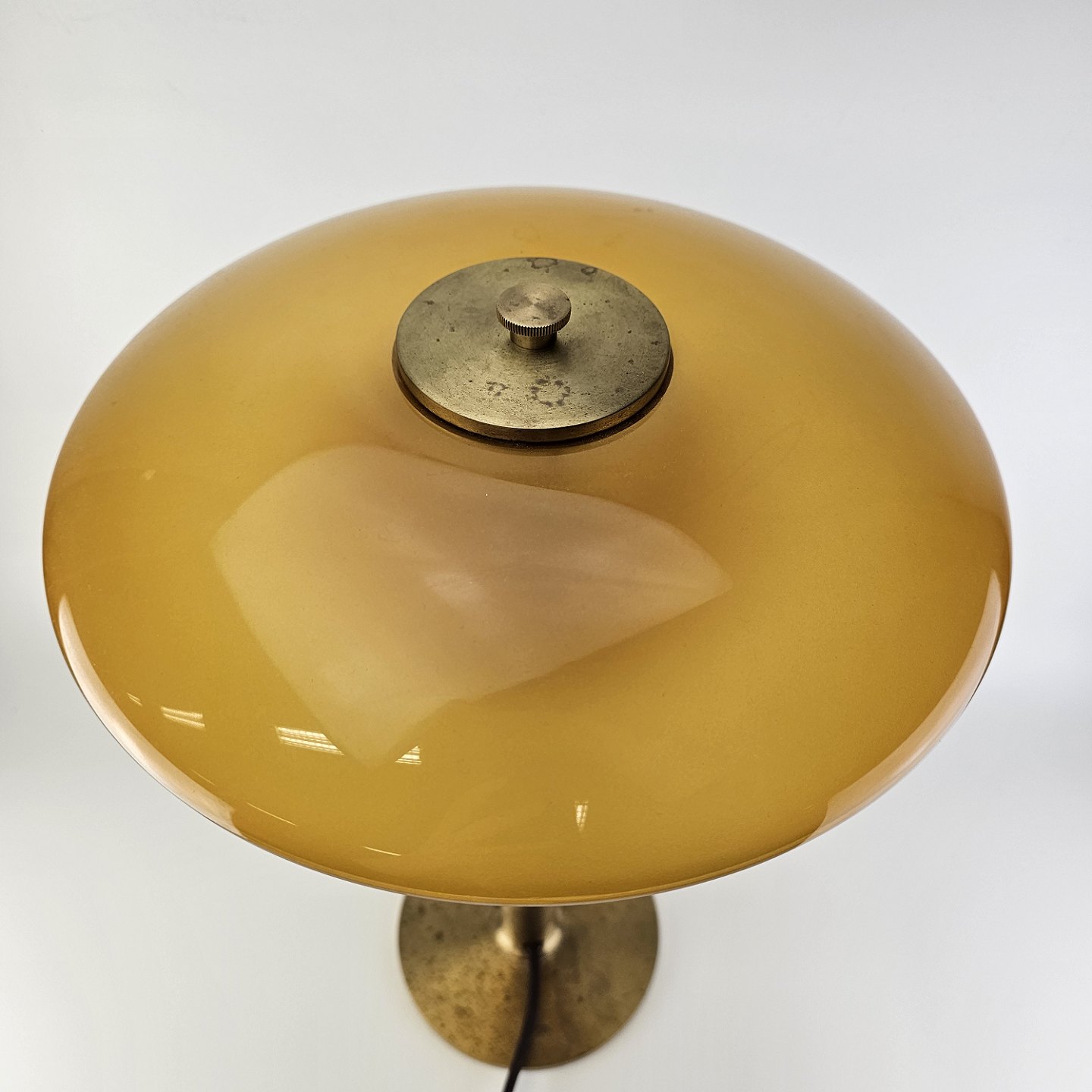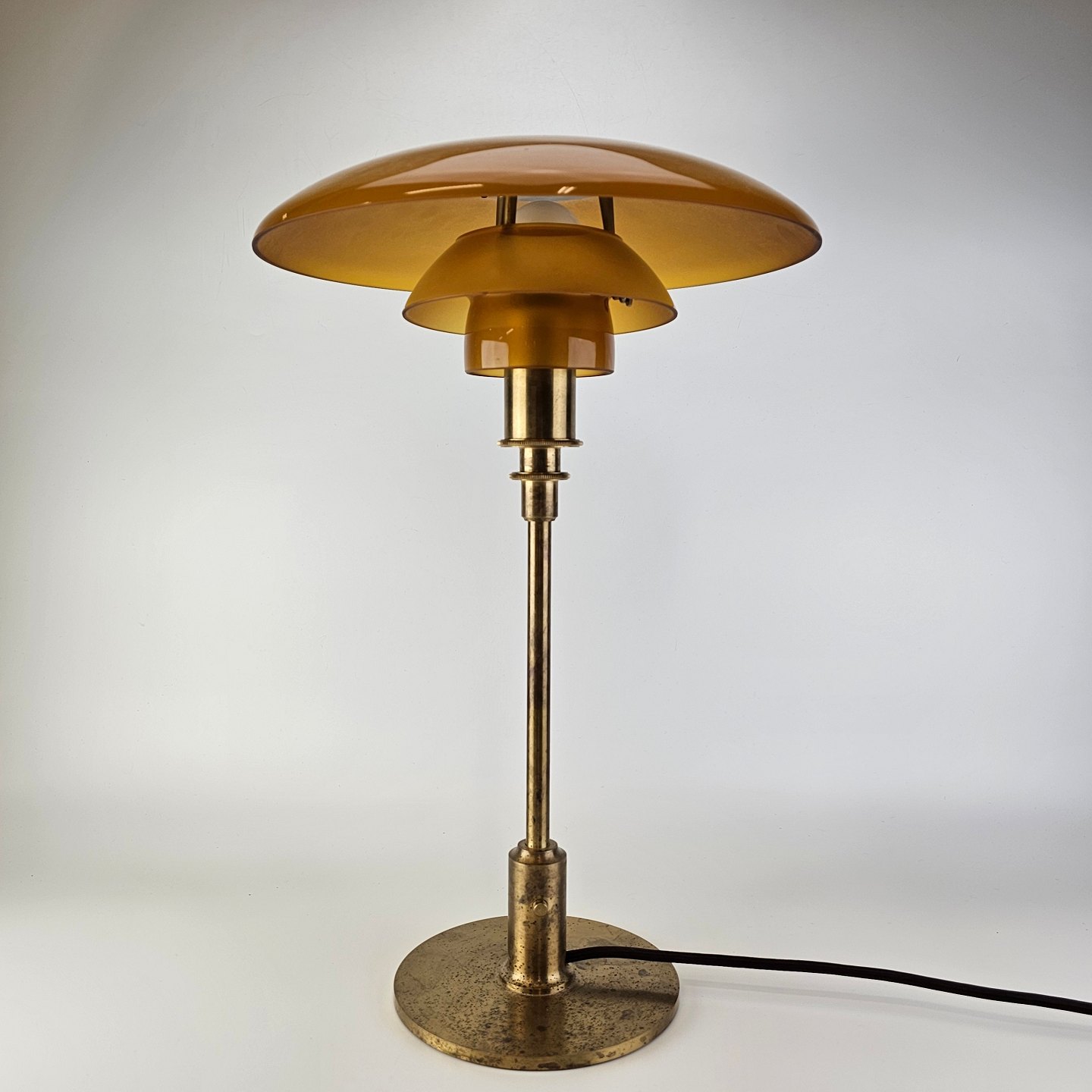 Text zugänglich auf Dänische: Bordlampe med skærm af mundblæst ravfarvet etlagsglas og fod af strøgslebet messing Limited edition udført efteråret 2018