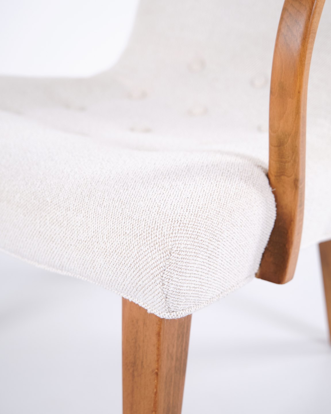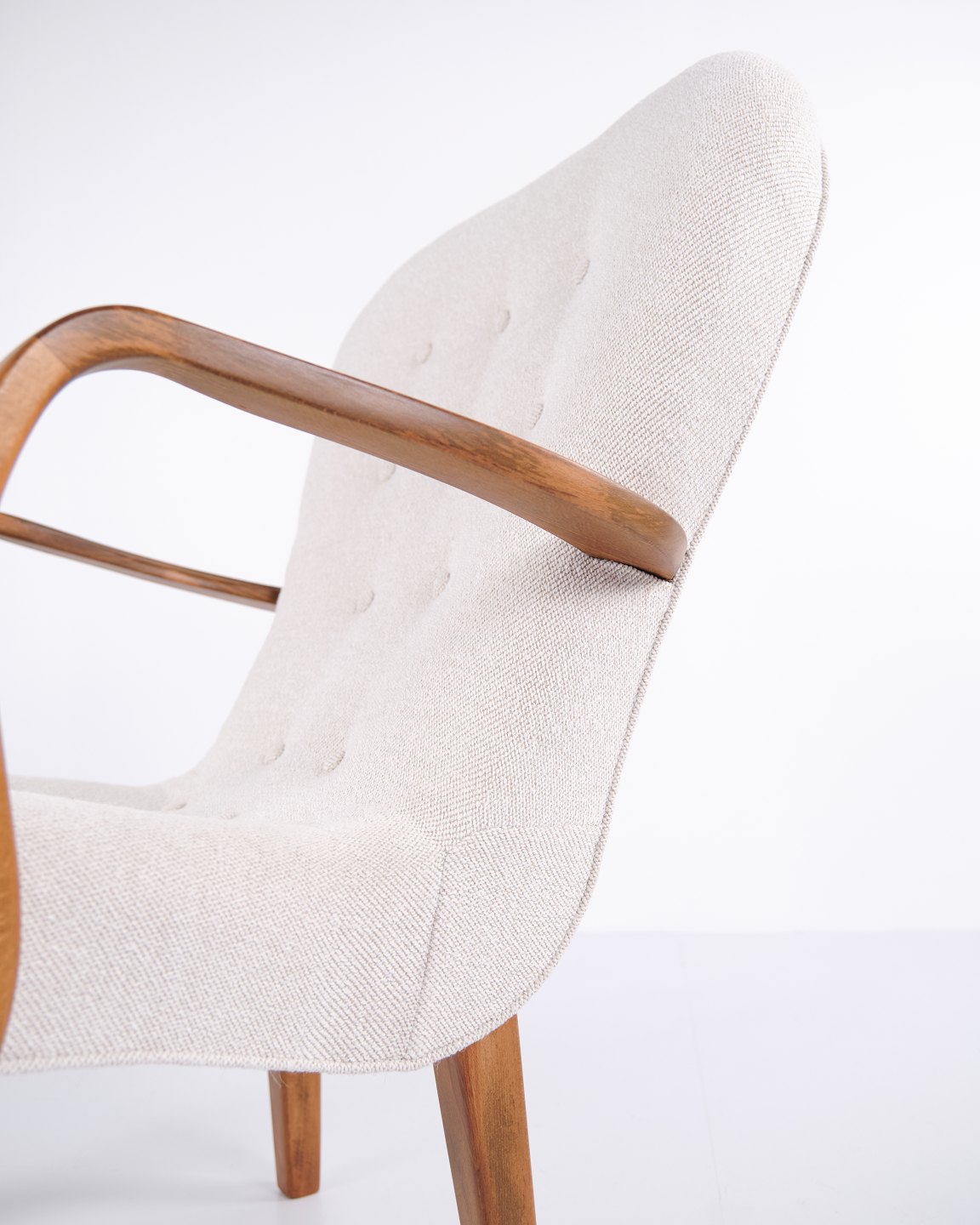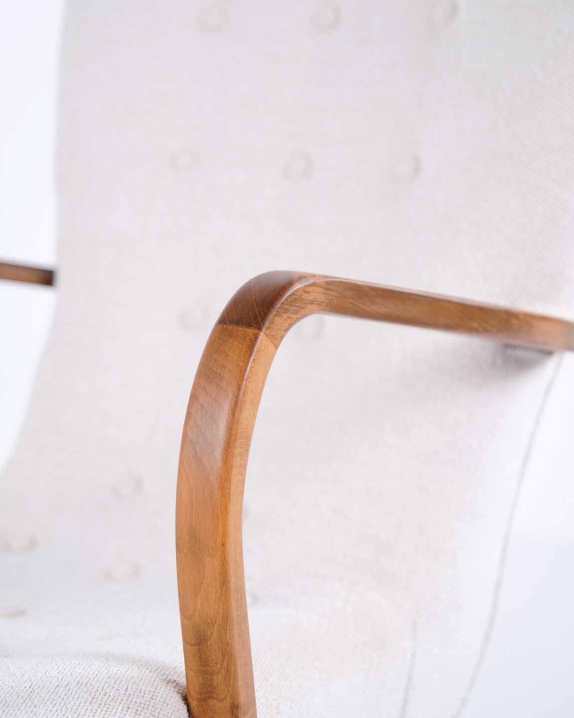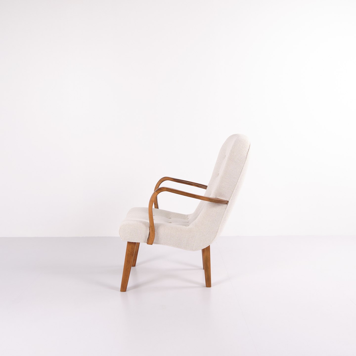 Klassischer Sessel aus den 1940er-Jahren, bezogen mit hellem Stoff und gestaltet in einer für die Zeit typischen, weich gerundeten Form. Mit aufrechter Rückenlehne und sanft geschwungenen Armlehnen. Entworfen von Alfred Christiansen.