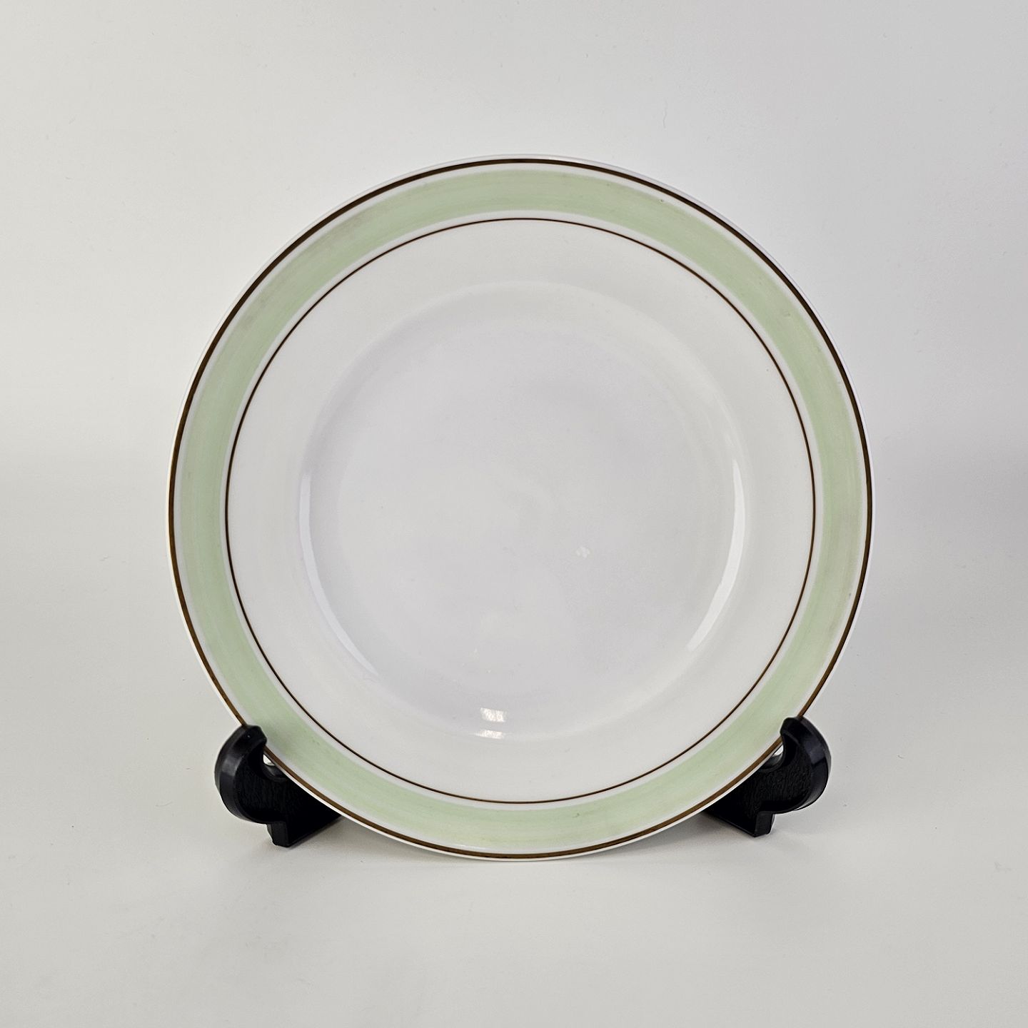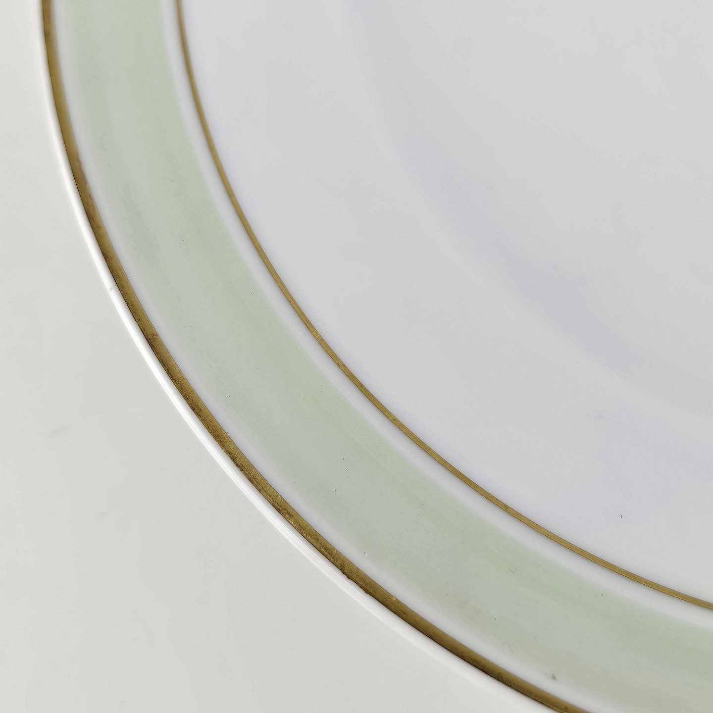 Glat hvidt porcelæn med lysegrøn bord og guldkant