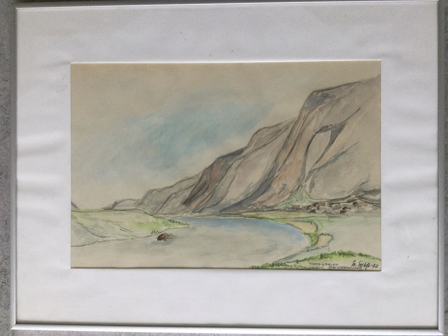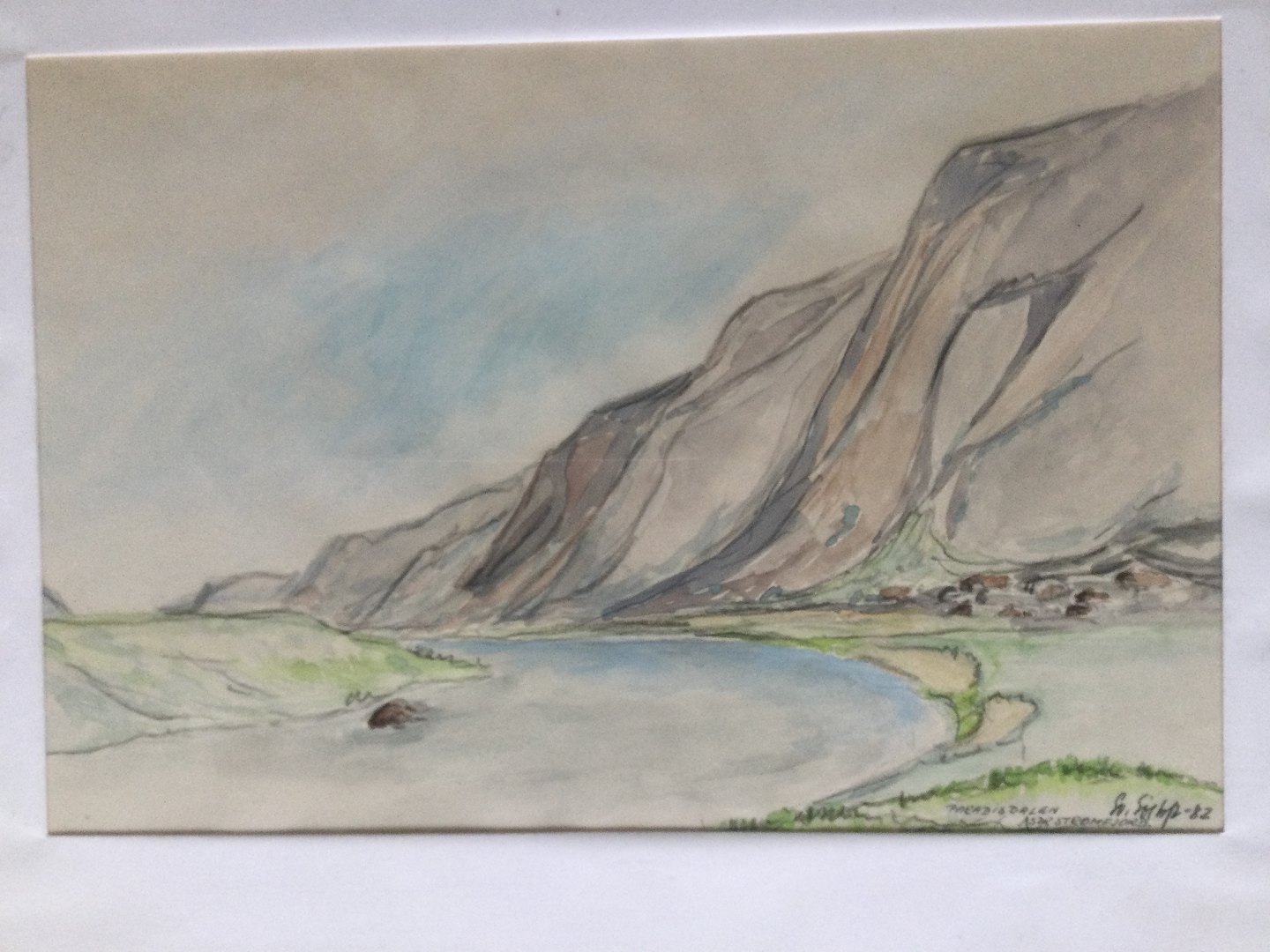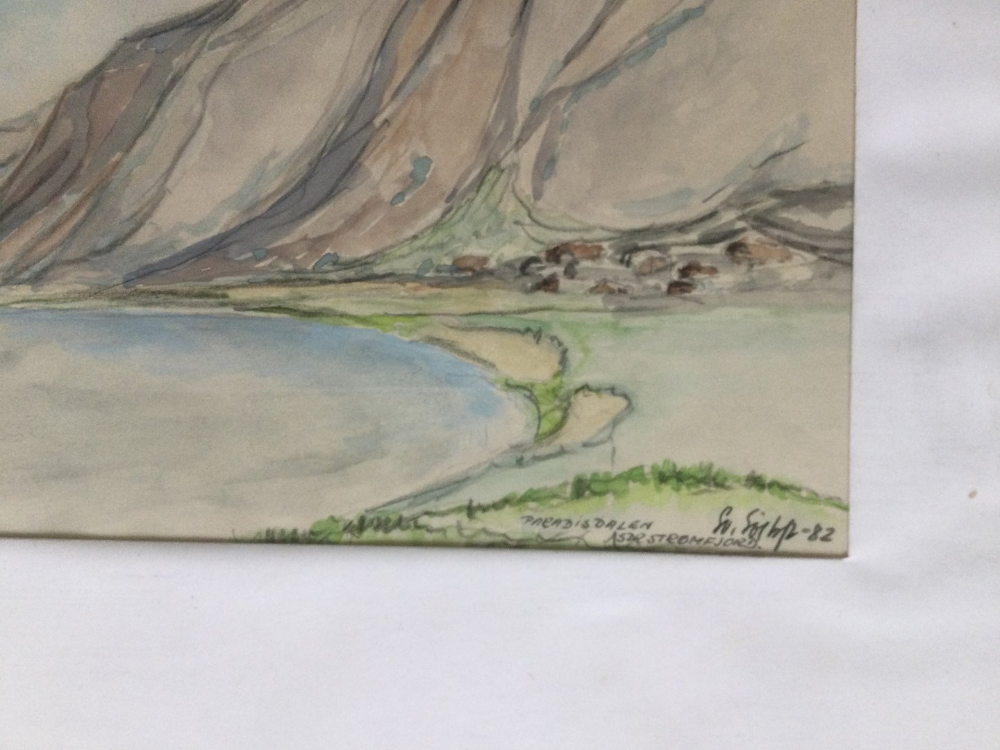 Text zugänglich auf Dänische: Akvarel af Svend Søltoft 1982 - Parti fra Paradisdalen, Store Strømfjord, Grønland.