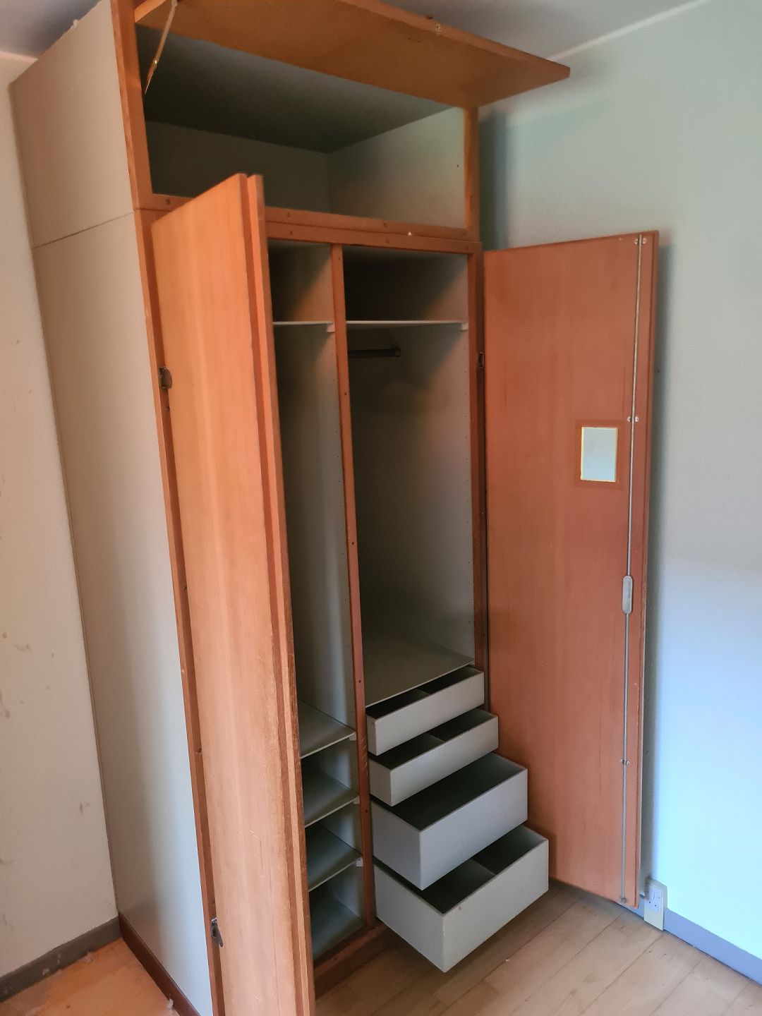 Text zugänglich auf Dänische: Boligens byggeskab fra 1960'erne med låger i Oregon pine designet af Børge Mogensen og Grethe Meyer. Fremstår i pæn brugt stand med uoriginalt spejl på indersiden af lågen og låsen virker, men griber ligesom ikke ordentligt fat. (Kan måske udbedres med lidt snilde) Kan evt. stå sammen med nr. 60675