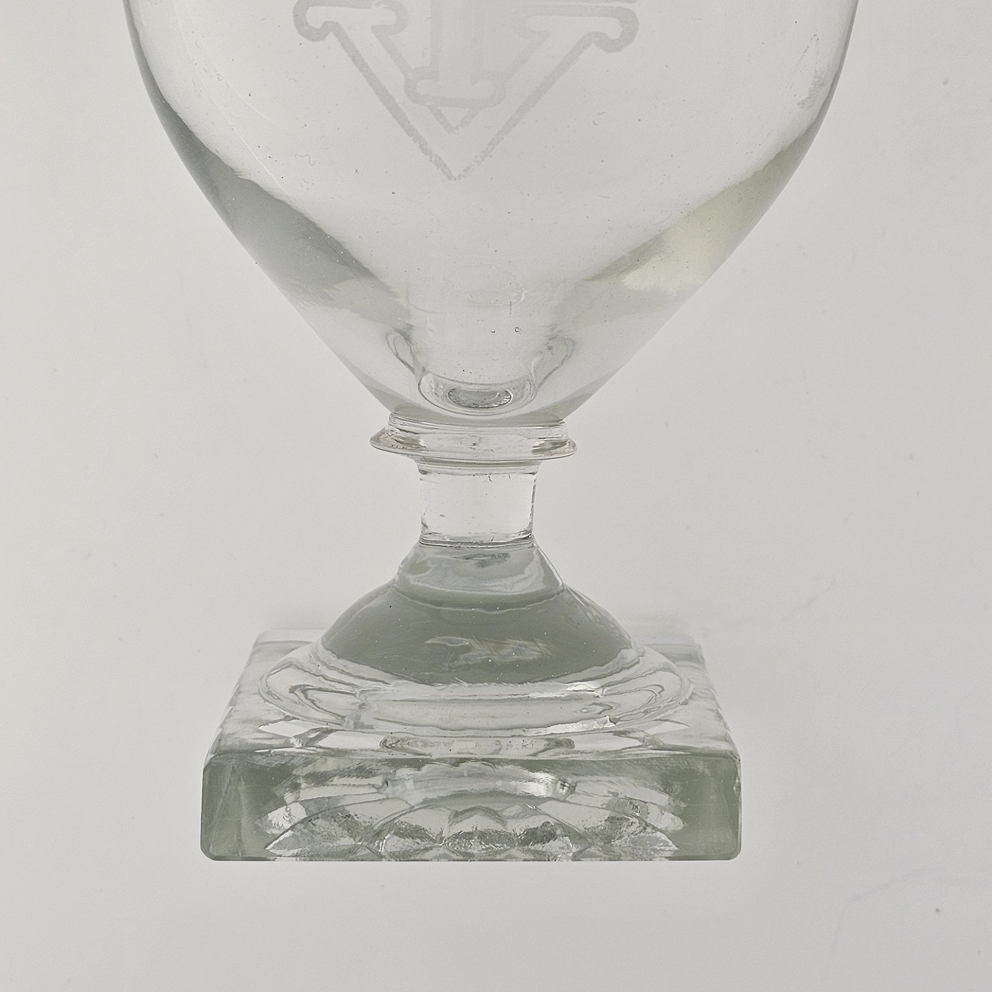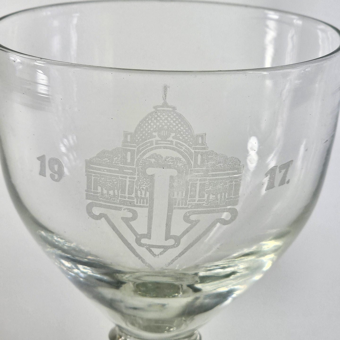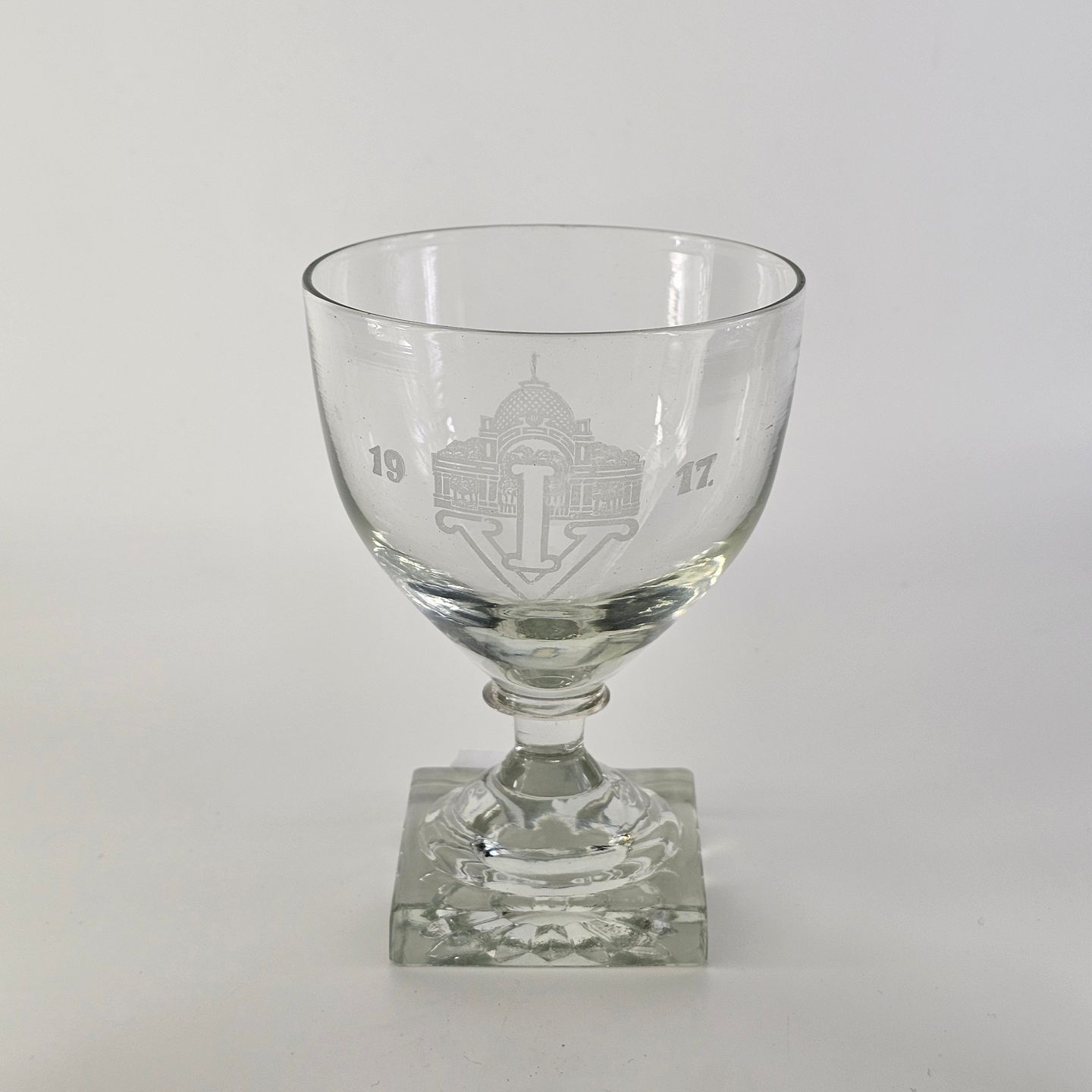 Vinglas med firkantet fod i mundblæst presset glas ætsning med motiv af Tivoli med bogstaverne IV og 1917