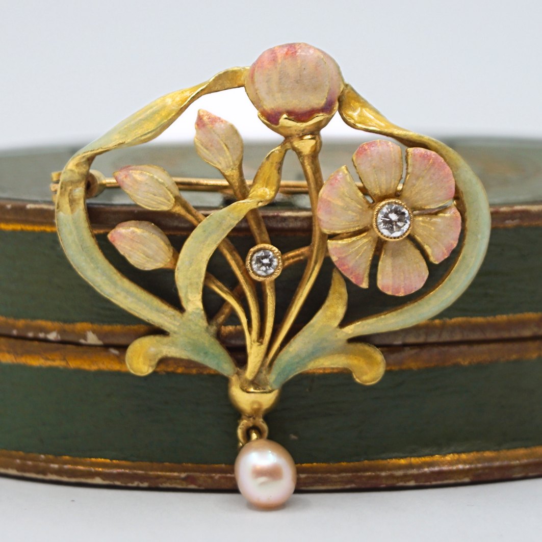 Text zugänglich auf Dänische: Art nouveau broche i 18 kt. guld med emalje, diamanter og perle
