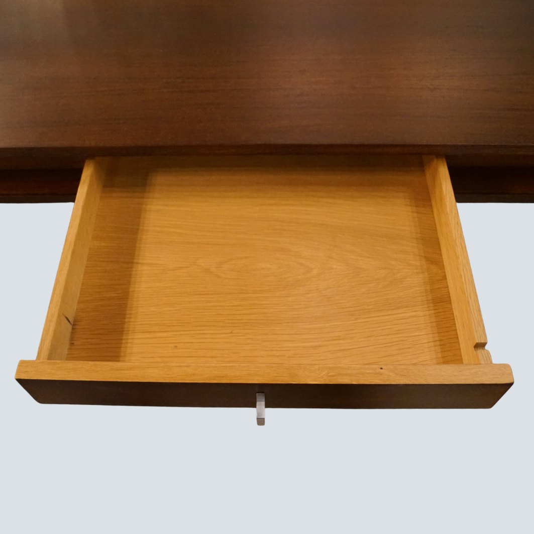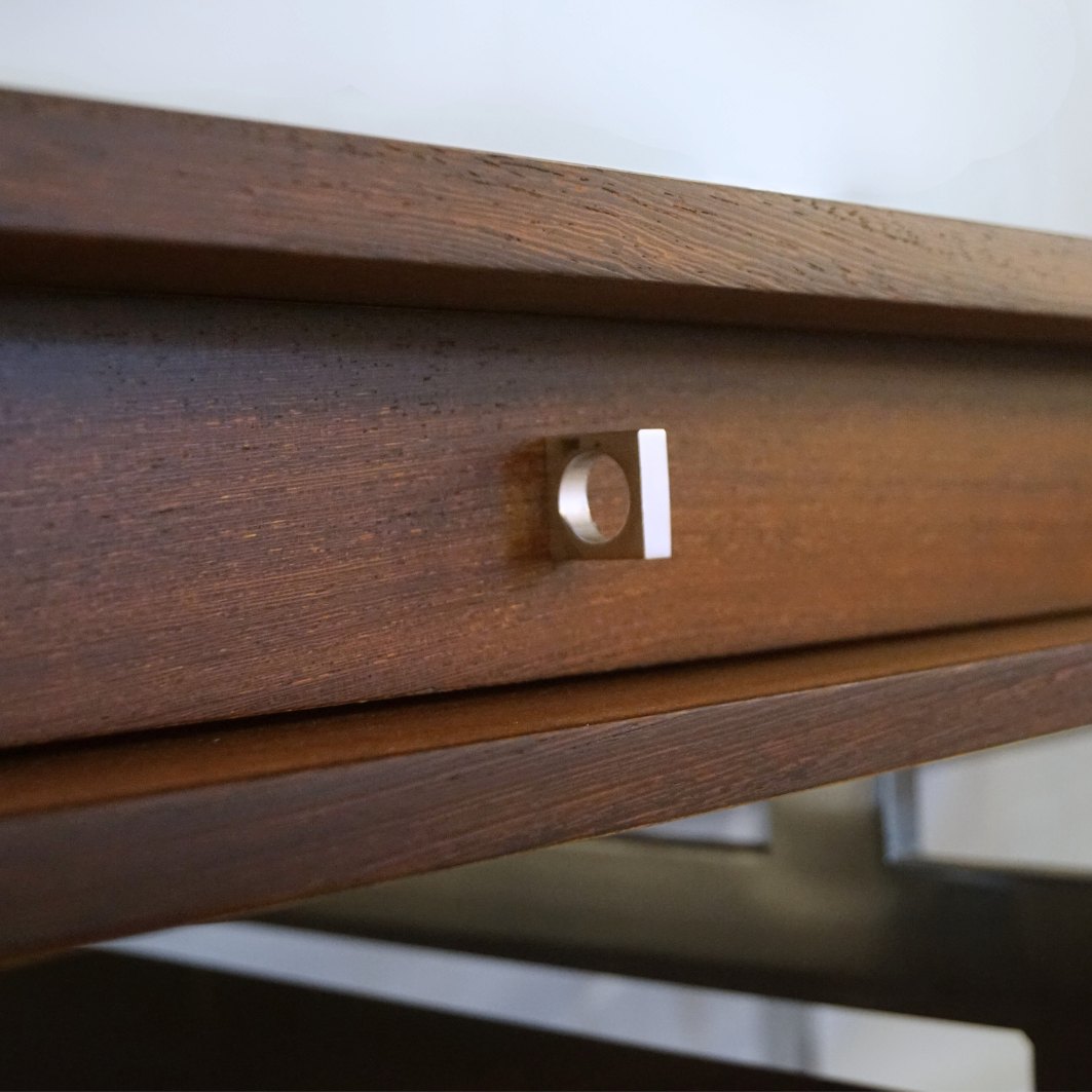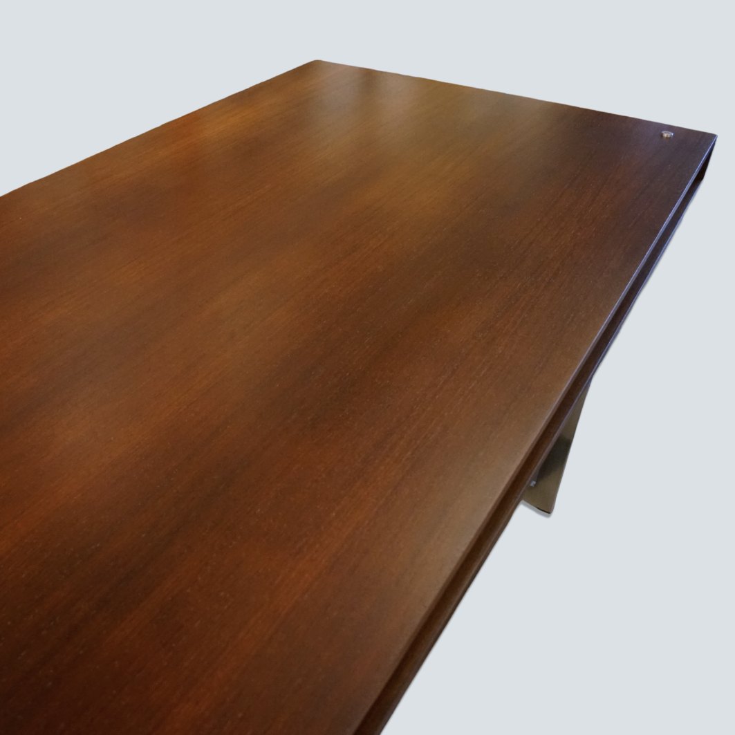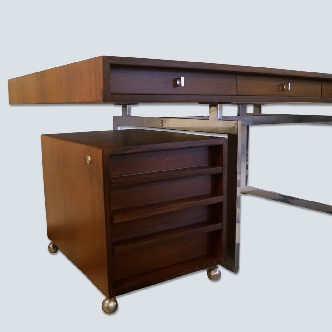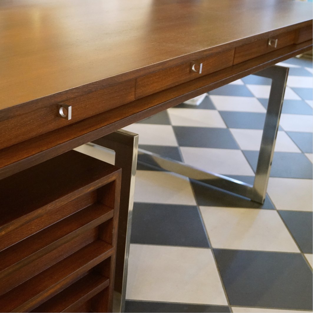 Text zugänglich auf Dänische: Bodil Kjær; Skrivebord af Wengé, med ben i forkromet stål