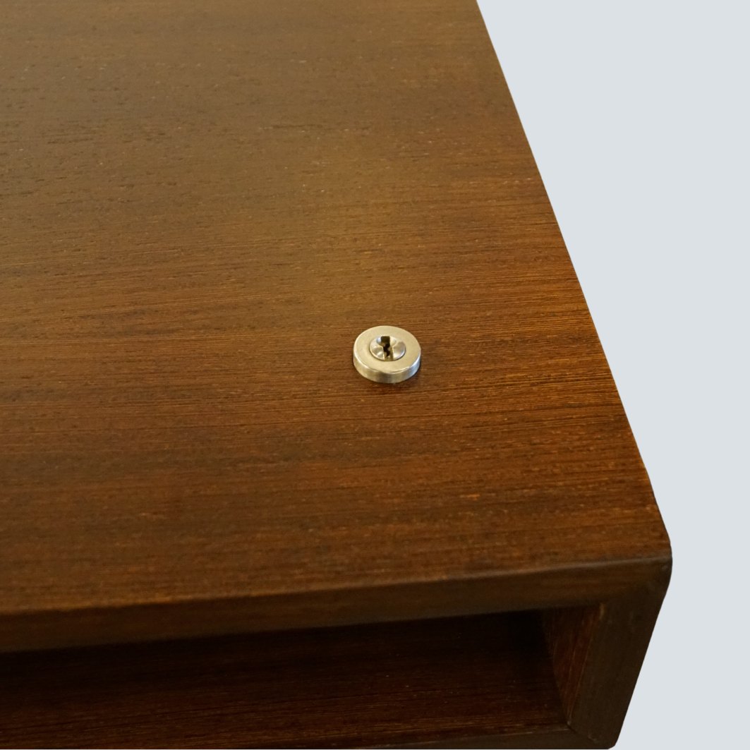 Text zugänglich auf Dänische: Bodil Kjær fritstående skrivebord af Wengé træ og ben i forkromet stål. Fire skuffer med centrallås. Skuffemodul på hjul medfølger. Tegnet af Bodil Kjær i 1959. Ikonisk design, også kaldt "Det smukkeste skrivebord i verden" og ses blandt andet i James Bond filmene.