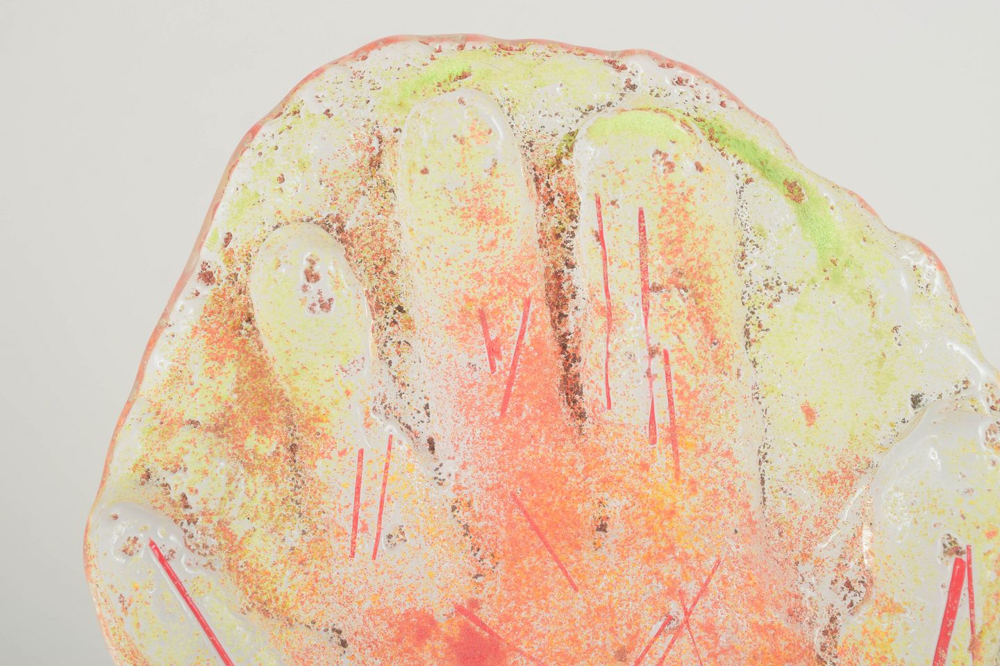 Håndformet glasrelief i form af en åben hånd, udført i transparente og fluorescerende nuancer af orange, gult og rosa med indlagte bladguldselementer. Et ekspressivt værk, der kombinerer symbolik og farveintensitet i typisk Ekegren-stil, hvor materialets lysrefleksion og overfladestruktur spiller en central rolle.