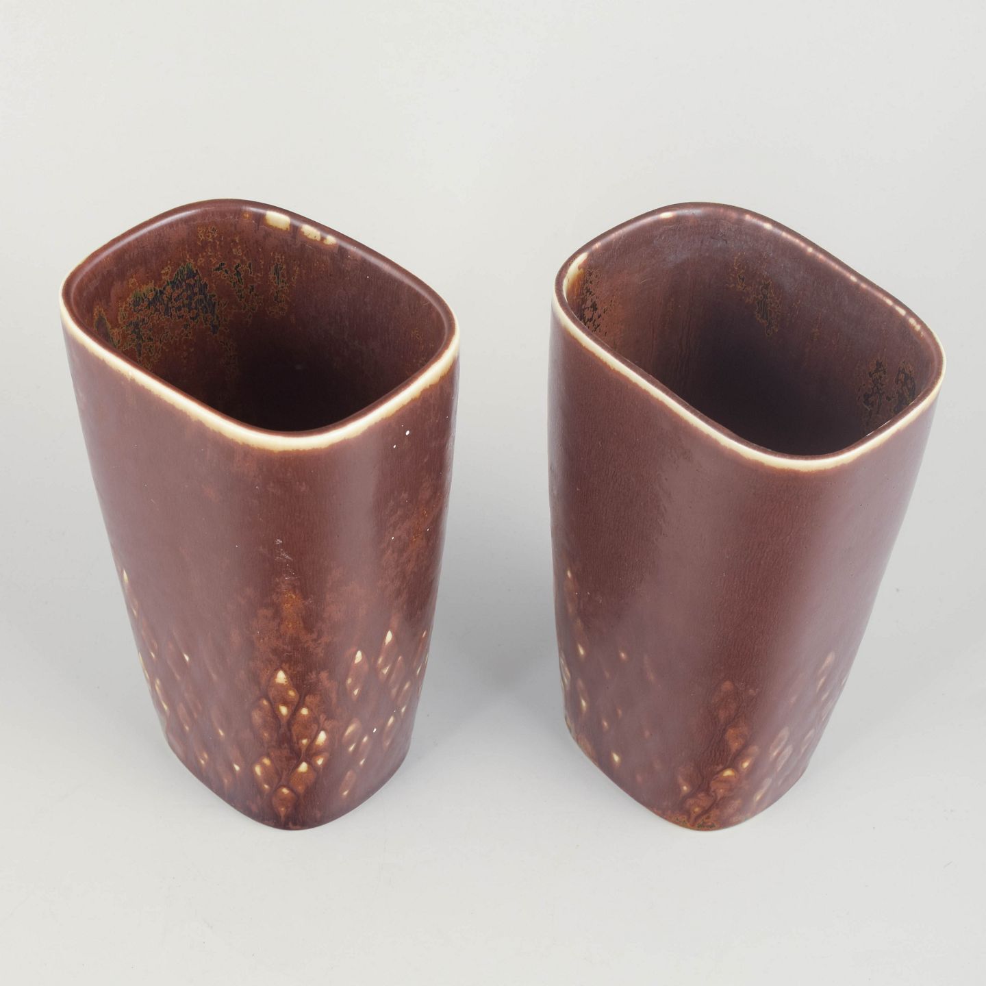 To rektangulære vaser i stentøj med afrundede hjørner og brunrød glasur med lysere løbende effekter. De harmoniske proportioner og glasurens subtile spil er typisk for Stålhane’s raffinerede formsprog i 1950’erne.