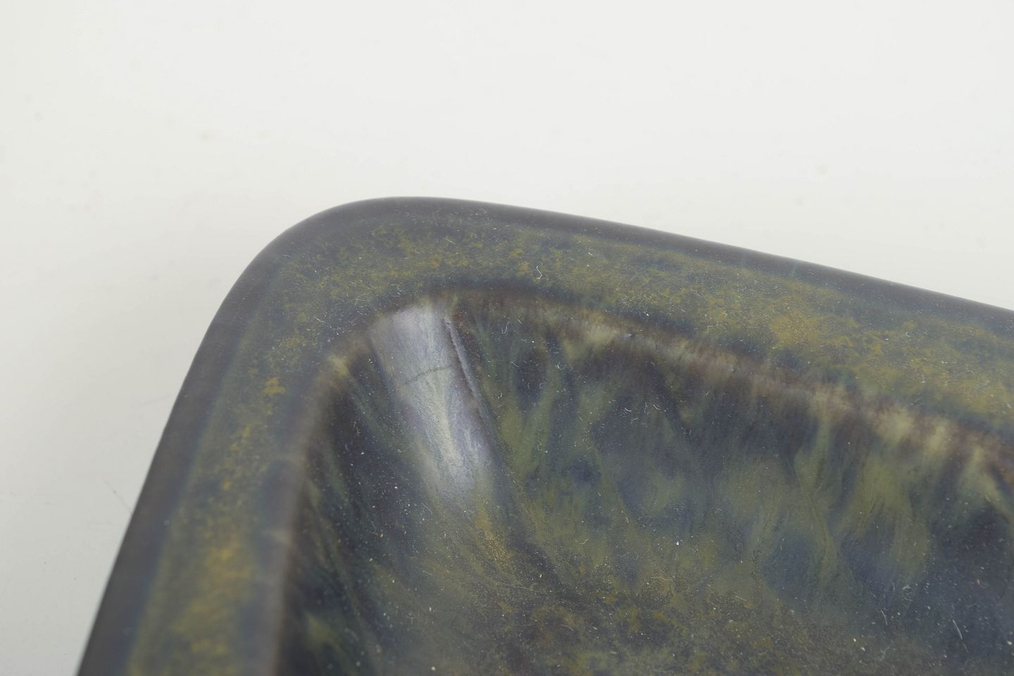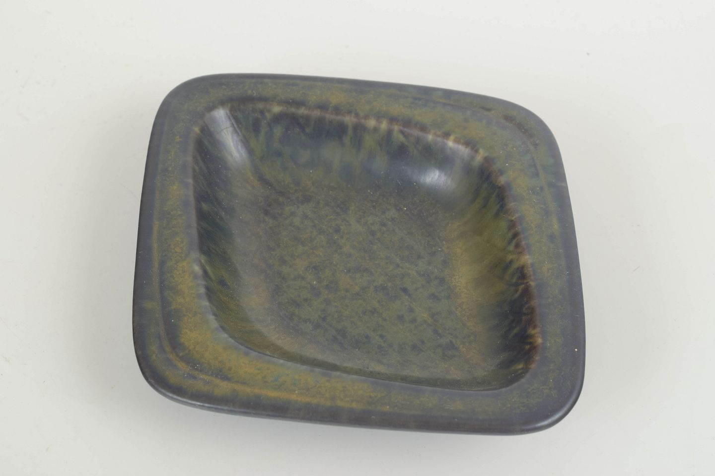 Lav, rektangulær skål i stentøj med grønlig glasur i changeringer fra olivengrøn til mørkere toner.
