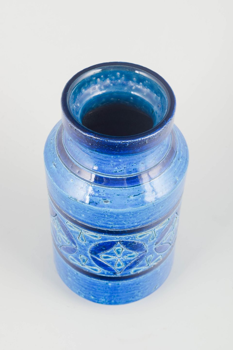 Høj cylindrisk vase i keramik med reliefdekoration og karakteristisk “Rimini Blu”-glasur i intense blå og turkise nuancer. Overfladen er håndglaseret med geometriske mønstre og brune bånd, der fremhæver seriens levende farvespil og tekstur. Et klassisk eksempel på Aldo Londis ikoniske formsprog for Bitossi.