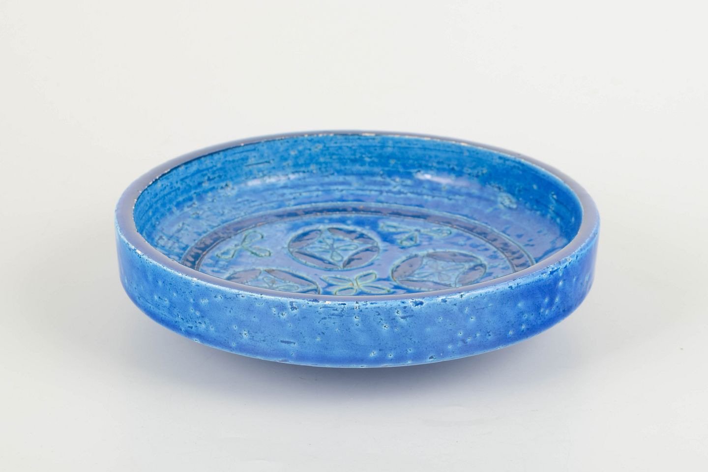 Dekorativ lav skål i keramik med reliefdekoration og karakteristisk “Rimini Blu”-glasur i klare blå og turkise nuancer. Et klassisk eksempel på Aldo Londis ikoniske design for Bitossi, hvor håndglaserede overflader og geometriske mønstre kombineres i en levende, skinnende farvepalet.